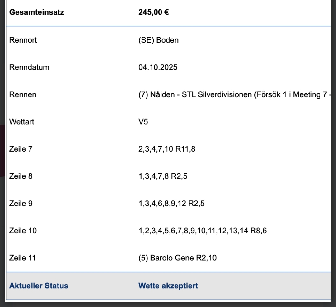Anbei unser Wettschein TG für den heutigen ARC, da er unter Privater TG nicht einsehbar ist.