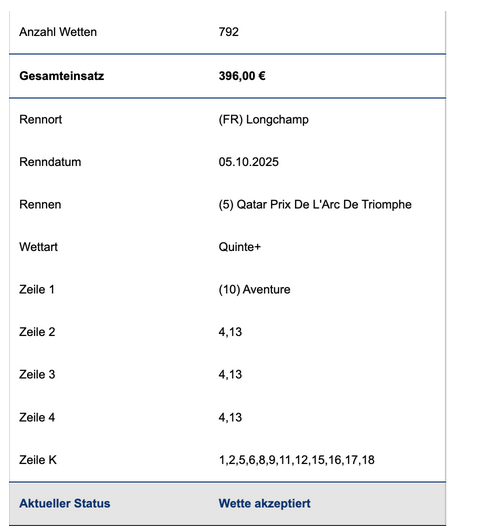 Leider gibt es im Arc in diesem Jahr nur eine kleine Ausschüttung. Trotzdem danke ich Allen die teilgenommen haben und wünsche einen schönen und erfolgreichen verbleibenden Sonntag. Bisher wurde nur der Frankreichschein ausgewertet, aber noch nicht ausgezahlt, daher bitte ich um Geduld. |