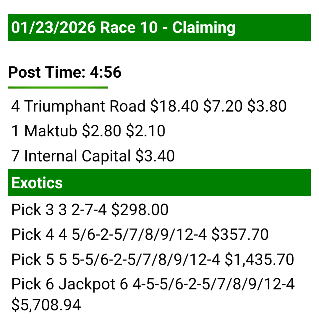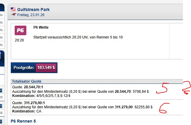 Ich hatte ja gestern eine P6 - TG in Gulfstream Park gemacht. Der 6er wurde nicht getroffen. Die TG hatte 5 Richtige! Gab es da nicht für 5 Richtige auch was zurück?