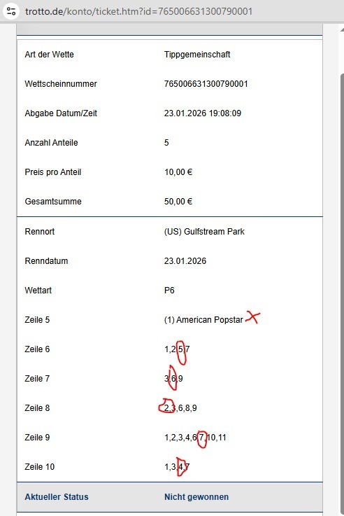 Die ersten drei Rennen waren schon gut (ein 3%er als A) aber ist halt doch Blödsinn gegen die ganzen JU -Favos zu gehen Trotz dreier Treffer wäre es ein deutlicher Verlust gewesen |
