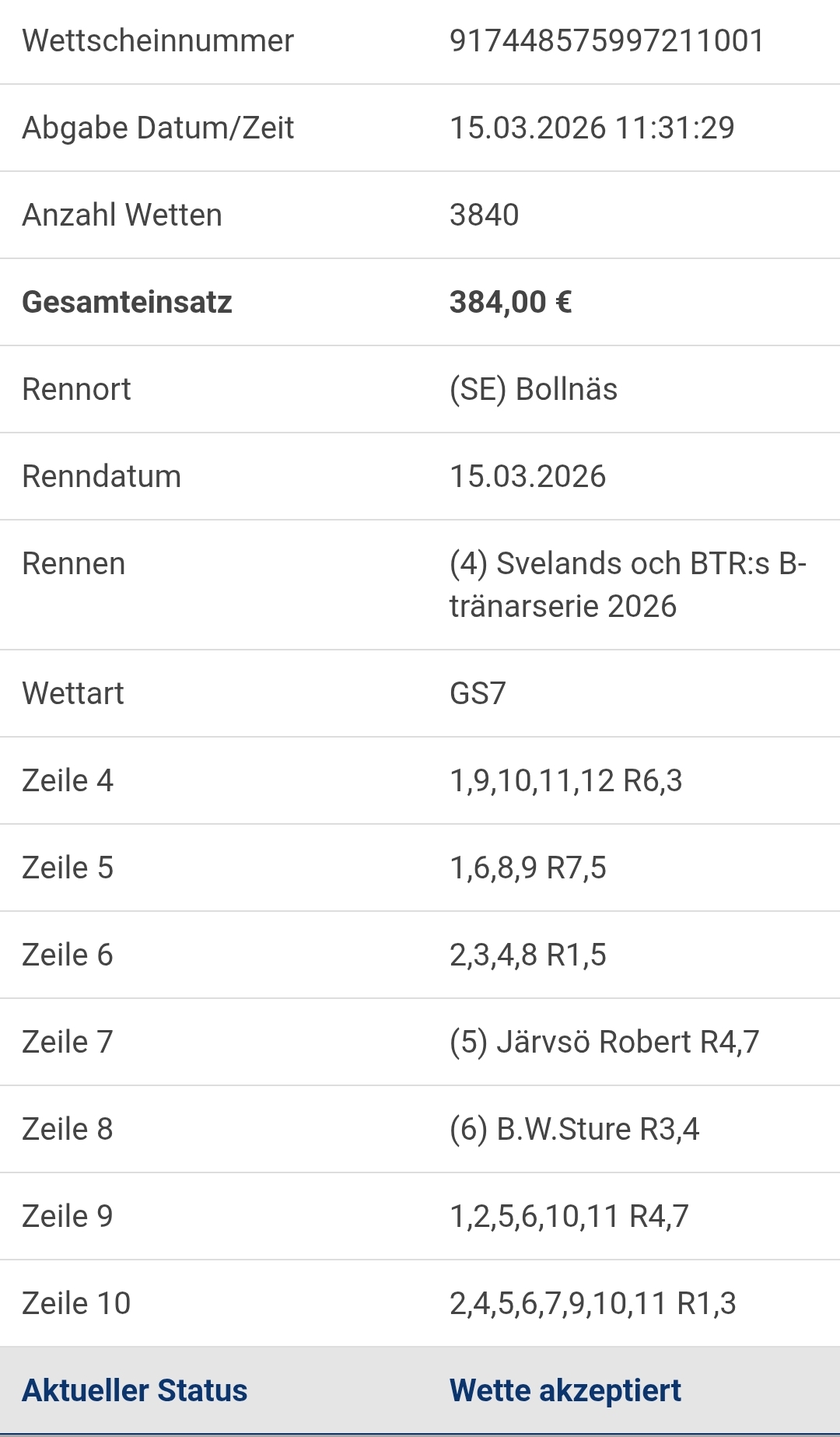 Wer konnte das ahnen, das der Favorit 77% zurückgezogen wurde ( meine Bank bei der TG bei der G7 ) und dadurch das Ersatzpferd ( 4 ) einspringen musste, wenn es wörtlich nimmt, war das so ( einspringen ) , den hätte ich natürlich nie gebänkert und somit hat sich meine TG verabschiedet Sorry an die Mitspieler, die gezeichneten haben, hoffe das dann noch einer kommt, der nicht auf den Schein war, dann ist das nicht so ärgerlich Zweite Bank natürlich drin, da wäre es schwer geworden nicht zu treffen Naja
