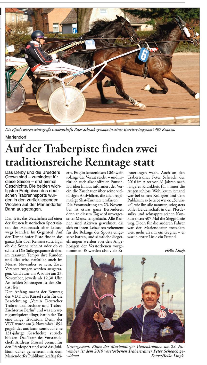Artikel über Mariendorf und den unvergessenen Trabertrainer Peter Scheack aus dem Lichtenrader und Rudower Magazin