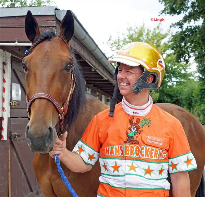 (hl) Auf der Berliner Pferderennbahn Mariendorf wurde am Wochenende die sogenannte Breeders Crown ausgetragen. Für die Teilnehmer aus Deutschland, Schweden, Österreich und den Niederlanden ging es um insgesamt 350.000 Euro Preisgeld. Das Event entwickelte sich zu einem Gala-Auftritt des amtierenden Deutschen Meisters Michael Nimczyk. Der in Willich (Nordrhein-Westfalen) beheimatete 39-jährige Sportler gewann fünf der acht Hauptläufe und sackte für die Besitzer seiner Pferde somit über 60 Prozent des Preisgeldes ein. Eine derartige Dominanz hatte es in dem seit 1998 ausgetragenen Wettkampf noch nie zuvor gegeben. Die bisherige Rekordmarke lag bei drei Hauptlauf-Siegen und wurde von den ebenfalls überaus prominenten Sulkyfahrern Robin Bakker, Roland Hülskath und Heinz Wewering gehalten.