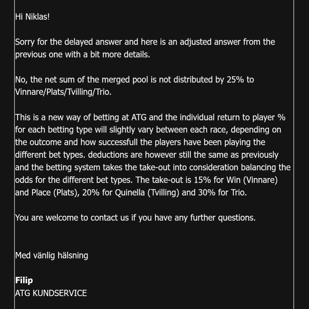 ist sehr zu begrüßen die Trennung. Die Quoten wurden mMn in etwa so ermittelt, wie bei einem toten Rennen. Im Endeffekt wurde die prozentual öfter getroffene Wette gegenüber der anderen auszahlungsmäßig bevorteilt. Wie bei totem Rennen der Fav. Wenn also bspw. ein Fav 3ter wurde war es für den Drilling uninteressant, für die Super4 aber ein großer Unterschied ob er 1. oder 3. wurde. So gab es in solchen Fällen riesige theoretische Abzüge (bis zu 80%) in der Super4. Theoretisch, weil es eben ein Pool mit dem Drilling war/ist. Jetzt soll es endlich wieder gerecht gehandlet werden. Gut so. Trio ordre/Super4 liegt wieder anders. |