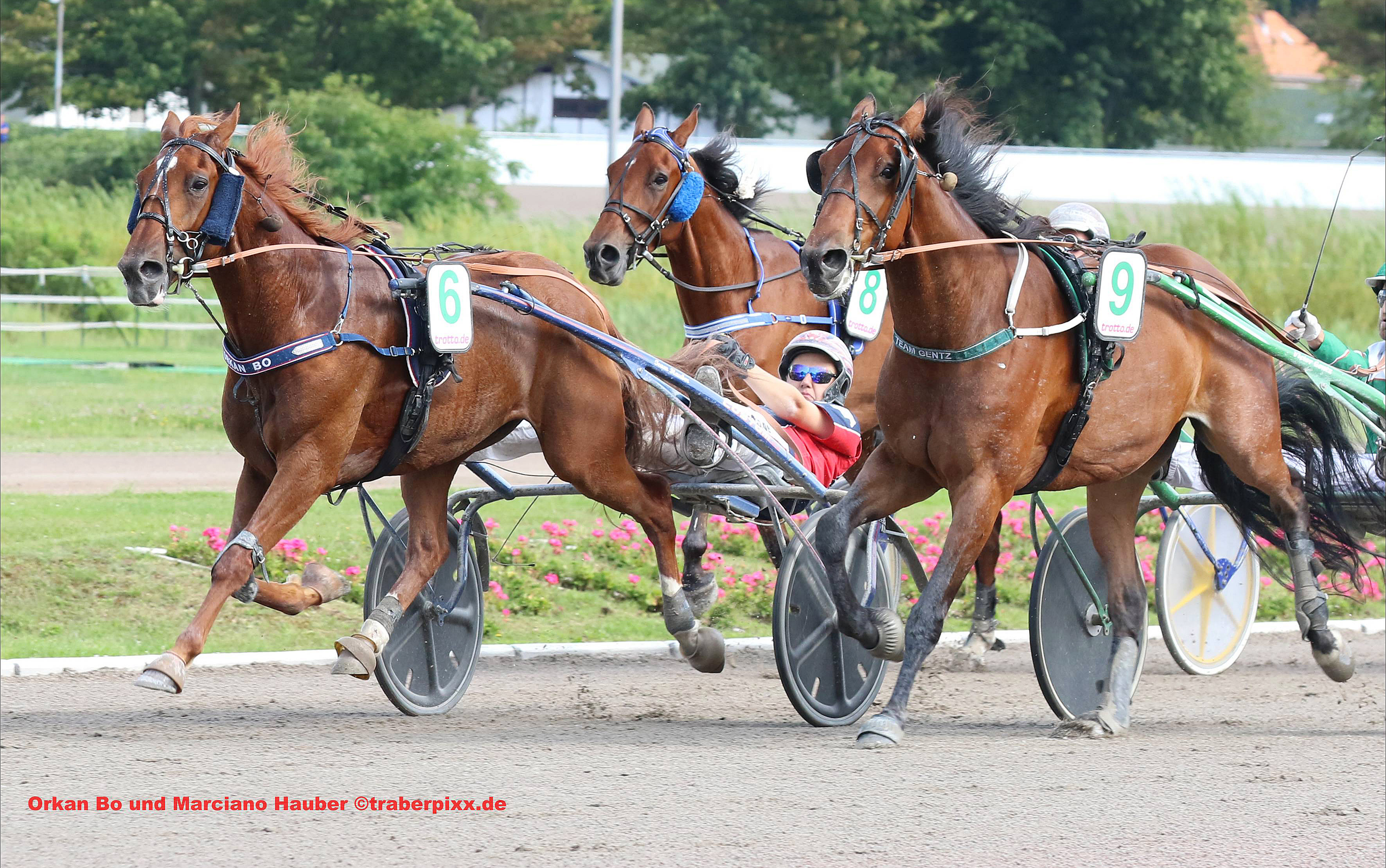 Im 2. Band steht Tyron Hill günstig im Band; absolviert aber den ersten Start nach einer langen Pause. Aber der Derby-Marathon-Sieger 6 Orkan Bo kann durchaus hier gewannen, sein Fahrer gab folgendes bekannt: „Orkan Bo ist sehr gut drauf, er tritt auf seiner Lieblingsbahn an“. Seriensieger 7 Intinori muss sich in dieser neuen Klasse noch zurechtfinden. Von der Spitze aus hat das am 21. September schon mal sehr gut funktioniert. Nun muss es auch aus dem Feld heraus klappen. Die Pferde aus dem Team Nimczyk, 5 Waldgeist und 9 Purple Rain treten beide ohne Eisen an, so dass man davon ausgehen muss, dass sie mit einem passenden Rennverlauf durchaus zur Stelle sein können.