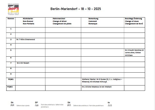 Die Wett-Highlights am 18. Oktober: 3. Rennen: Start der V7+ Wette mit 20.000 Euro Garantie inkl. 5.830 Euro Jackpot 7. Rennen: Start der V3-Wette mit 5.000 Euro Garantie inkl. 2.000 Euro Jackpot Zweierwetten-Gewinnspiel für Bahnbesucher um 1.000 Euro in den Rennen 1-4 Prämienausspielung um 2.000 Euro an Wettgutscheinen und 1.740 Euro an Sachpreisen über die Siegwette der Rennen 1-9. Alle Prämienlose der beiden Breeders-Crown-Veranstaltungstage nehmen zugleich an einer weiteren Ziehung teil: Dort gibt es ein sofort verfügbares trotto.de-Wettguthaben in Höhe von 5.000 Euro zu gewinnen! Jackpot-Betting-Lounge: Startpreis 500,00 Euro. Die Teilnehmer erhalten dafür zahlreiche Sonderkonditionen: 550,00 Euro an Wettgutscheinen, Eintritt, Sitzplatz, Rennprogramm, fünf Getränke. Anmeldung unter office@rennbahn-berlin.de erforderlich.