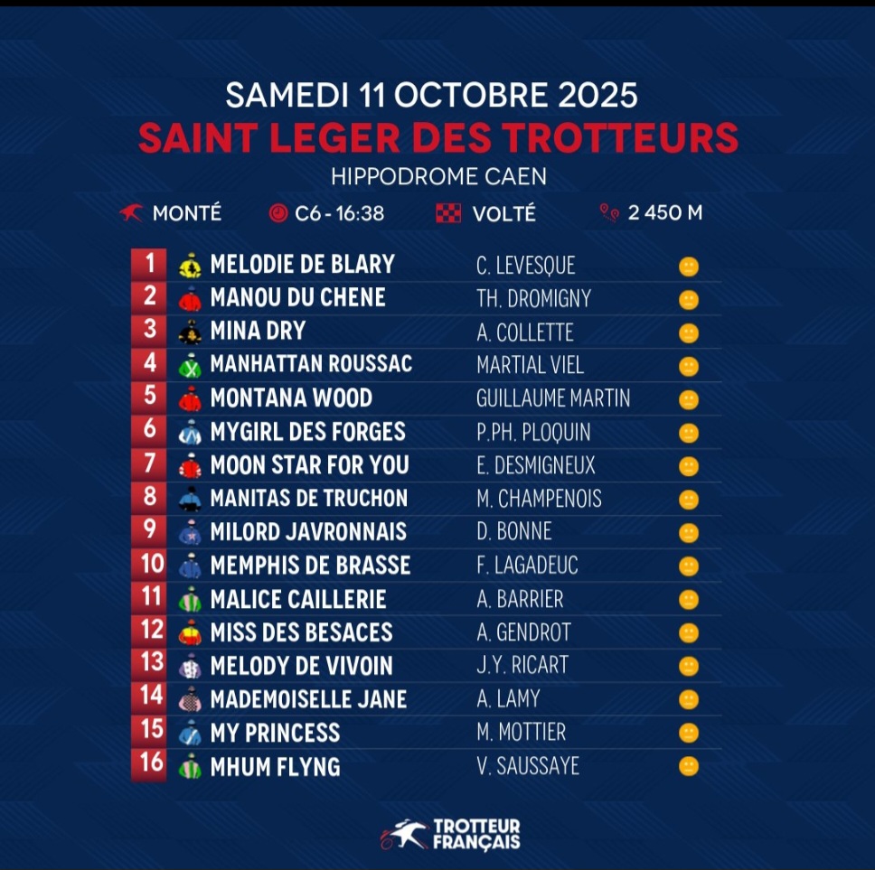 Samstag in Laval "Joueuse Du Mirel (111) läuft mit Eisen auf hartem Boden. Sie ist in ihrer Klasse, hat aber auch keinen Spielraum mehr. Wir werden vorsichtig fahren und versuchen, sie ins Ziel kommen zu lassen. Wenn sie in Form ist, hat sie einen starken Endspurt. Läuft alles glatt, ist ein kleiner Platz drin. King Fromentro (212) ist ein gutes Pferd. Er wird sich in Laval wohlfühlen. Ich bin ziemlich zuversichtlich - er könnte gewinnen. Lawman (314) zeigt mal gute, mal schwächere Leistungen. Er hatte eine gute Phase, die letzten Rennen waren etwas weniger überzeugend. Wenn er gut drauf ist, ist er vorne mit dabei. Für Izia De Mongival (409) ist es ein gutes Rennen. Läuft es ohne Störungen, wird sie stark ins Ziel kommen. Dieses Feld liegt ihr." Sonntag in Segre (PMH) "Infiniment Citron (613) läuft wieder auf Gras. Auf diesem Belag ist er fast fehlerfrei. Der kleine Kerl ist gut drauf. Zuletzt war er in Vincennes unterwegs. Es liegt nicht daran, dass er die Bahn nicht mag, aber den Anstieg dort packt er nicht. Wir wollen versuchen, seine Saison schön zu beenden. Die anderen Starter an diesem Tag sind für mich Neuland. Mal sehen... In Cordemais (PMH) hat Hotel Mystic (605) Startplatz 5 hinter dem Auto und läuft mit Jean-Philippe Monclin. Beim letzten Mal hätte er in Vincennes gewonnen, aber die lange Gerade von Enghien lag ihm nicht. Er gab nicht alles. Am Ende wurde er Dritter. Die Leistung war gut, aber ich fand ihn nicht besonders ehrgeizig. Jetzt läuft er recht dicht hintereinander, aber er ist in Form. Nur: ich kann ihn nicht ohne Eisen starten (siehe Statement unten). Lilie d’Omaha (512) ist kugelrund. Sie bereitet sich auf das Wintermeeting vor. Von den Gewinnsummen her passt sie für die Wintersaison gut." Montag in Enghien "Dort fahre ich zwei Pferde von Jean-Philippe Raffegeau. Beim letzten Mal lief es für Le Miracle gegen den Rennverlauf. Auf der flachen Bahn wird er sich besser schlagen. Den sollte man nicht abschreiben. My America gibt ihr Comeback. Weitere Infos habe ich nicht." Mittwoch in Enghien "Dort werde ich Le Voila Sautonne steuern, der ein passendes Rennen hat, und auch Jolydole." Die Beschlags-Regel schlechte Idee "Ich verstehe diese Regel nicht. Meiner Meinung nach ist sie unnötig. Wir schützen unsere Pferde. Wenn sie schlechte Hufe haben, starten wir sie nicht ohne Eisen. Wir wissen, wie wir ihnen Komfort verschaffen. Die Regel wurde wegen einiger Missbräuche eingeführt. Wenn ein Pferd blutet, weil es keine Hufe mehr hat, dann muss der Verantwortliche hart bestraft werden - völlig zurecht. Aber so müssen jetzt alle darunter leiden. Das ist wie bei der Peitschenregel: wer seine Pferde schlägt, soll bestraft werden. Aber man darf nicht alle über einen Kamm scheren. Das ist eine 'falsche gute Idee'. Wir haben dieses Problem schon mehrfach angesprochen. Bei einem Pferd wie Iguski Sautonne weiß ich, dass ich auf diesem Niveau einen Nachteil habe." Die Qualifikationen - ein guter Vormittag "Am Donnerstag in Meslay-du-Maine habe ich 10 von 11 Pferden durch die Qualis gebracht. Mein Rekord liegt bei 13 von 14 - nicht schlecht! Besonders gefielen mir die Stuten am Ende der Prüfungen, vor allem Nice Cerize, eine Tochter von Booster Winner und Utopie Cehere, die sich sehr gut qualifiziert hat (17,7). Bei den Hengsten habe ich unter anderem No Looking Back (v. Italiano Vero) durchgebracht, der ebenfalls sehr ordentlich war. Die Zeit (19,4) täuscht, weil die Bahn am Anfang langsamer war. Schon früher in der Saison hatte ich acht Pferde qualifiziert. Einige frühreife, gut gezogene Pferde haben bereits wieder mit dem Training begonnen und werden bald starten, anders als das Lot von heute. Diese bleiben bis Jahresende im Stall und greifen im Januar wieder an. Insgesamt bin ich zufrieden: sie haben sich gut verhalten und sind im Ziel schneller geworden. Genau das wollte ich. Es war ein guter Vormittag." Frank Gio - Qualifikation am Grünen Tisch im UET-Vorlauf Frank Gio war in Topform, aber es war ein schwieriges und turbulentes Rennen. Ich musste viel managen. Vor mir lief L’As Desbois ohne Bremse, hinten saßen die 'Jäger'. Ich musste das Tempo dosieren, um ihnen nicht zu früh Windschatten zu geben. Das ganze Rennen brauchte ich quasi einen Rückspiegel. Ich fand, ich hatte es nicht schlecht im Griff. Doch unter Druck zog L’As Desbois plötzlich nach rechts. Damit hatte ich überhaupt nicht gerechnet. Das hat uns gekillt! In dem Moment wollte ich meinen Schützling gerade zum Endspurt ansetzen. Er kam richtig in Fahrt, aber wir wurden komplett blockiert. So ist es... Die Stewards haben danach ihre Arbeit gemacht und uns am Grünen Tisch weiterkommen lassen. Aber das ist nicht dasselbe. Ich bin überzeugt, dass mein Pferd mit Lovino Bello um den Sieg gekämpft hätte. Für das Finale in Solvalla (11. Oktober) hatten wir als Vorletzte die Wahl - Startplatz 12 hinter dem Auto wird schwieriger. Aber mein Pferd ist in perfektem Zustand." Ksar meldete sich zurück in Le Croise-Laroche "Ksar war im Criterium richtig gut drauf, ist aber gleich am Start ins Galoppieren gekommen. Etwas, dass ihm sonst nie passiert. Sehr schade. Wir waren enttäuscht, aber in Le Croise-Laroche hat er gezeigt, dass er in Form ist (Zweiter). 50 Meter aufzuholen war nicht einfach, er lief 12,3. Ich bin zufrieden, das Gefühl war gut. Er ist jetzt am Ende seines fünften Lebensjahres und wird in interessante Rennen hineinwachsen. Von der Gewinnsumme her kann er bald auch gegen ältere laufen. Ich erwarte ein gutes Meeting." Arc 2025: Christophe mit Startplatz 1, wie damals mit Zarkava "Ich mag Aventure, aber mit Startnummer 12 wird es schwerer. Für Maxime (Guyon) ist das kein einfacher Platz. Er hat zwar gerade den Prix Vermeille mit ihr gewonnen, und die Wahl (gegen Sosie) war logisch, aber jetzt wird er weit außen stehen. Christophe (Soumillon) hat mit Minnie Hauk Startplatz 1. Das erinnert an Zarkava (Arc 2008)! Für mich ist Soumillon Favorit. Die Japaner hatten bei