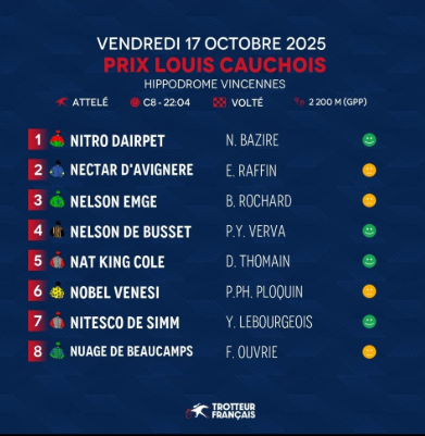 Jappeloup Turgot, der bei seinem einzigen Start in Feurs in der hervorragenden Zeit von 12,8 gewann, und dies ohne Windschatten, startet aus dem ersten Band und genießt das Vertrauen seines Fahrers und Trainers Matthieu Abrivard: "Dieses Rennen gehört zu seinen Zielen. Er ist vielseitig und kann alles. Da es einige Tempomacher geben wird, kann er mit seiner besten Leistung durchaus aufs Podium laufen", sagt Abrivard, der auch zugibt, seinen Schützling beim letzten Mal in Vincennes nicht optimal gesteuert zu haben.
