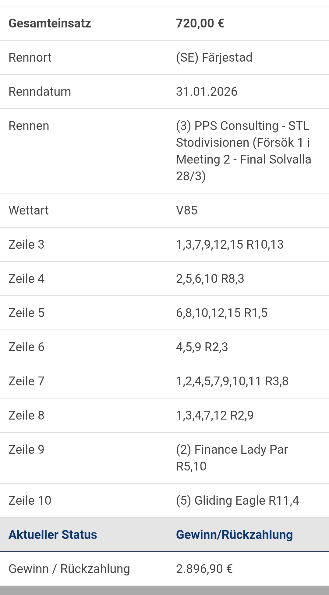 Da war heute mehr möglich in unserer privaten TG, leider bekommt Finance Lady Par ein scheiß Rennen und wird zweiter , andere Bank genommen, dann