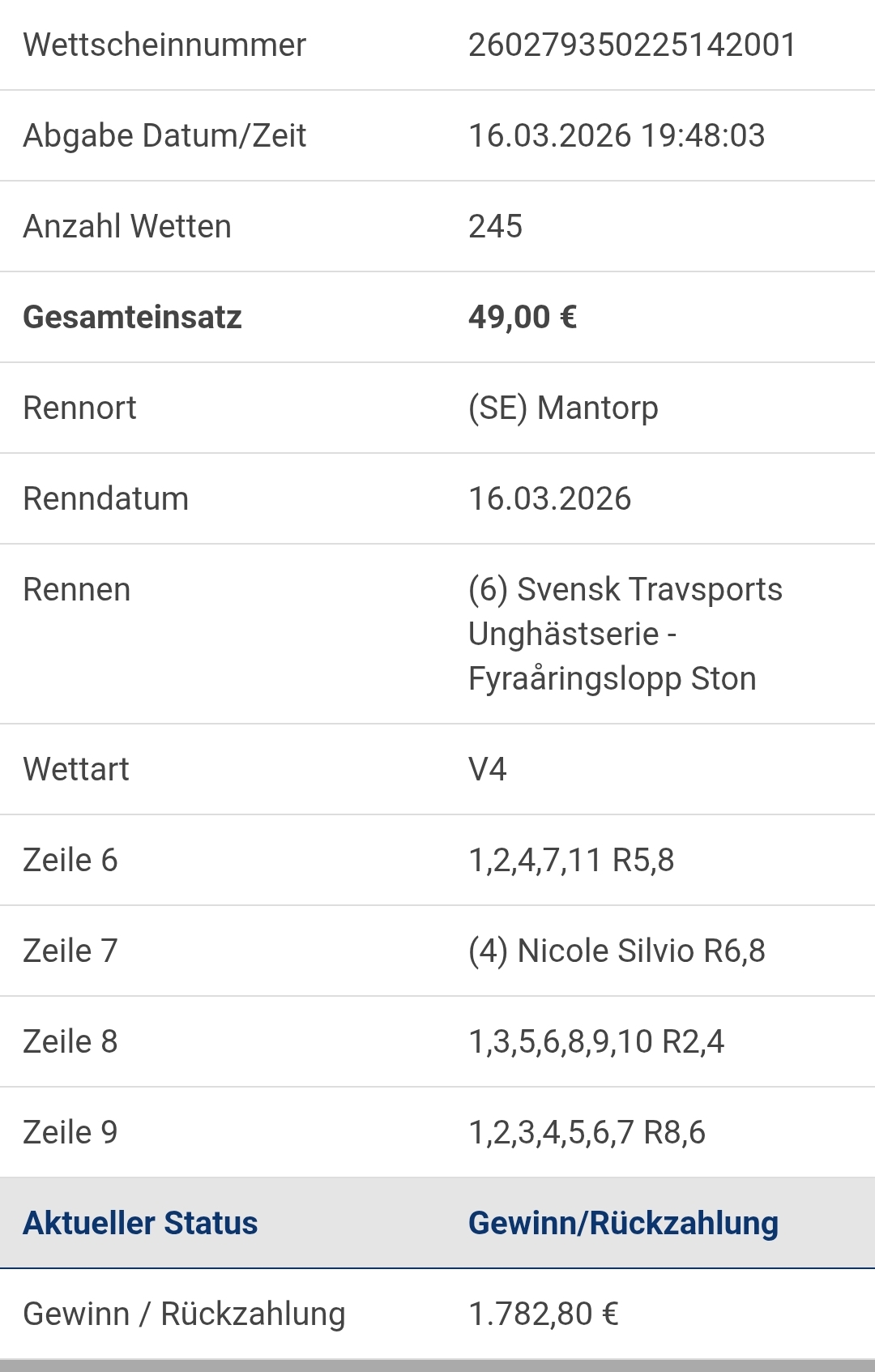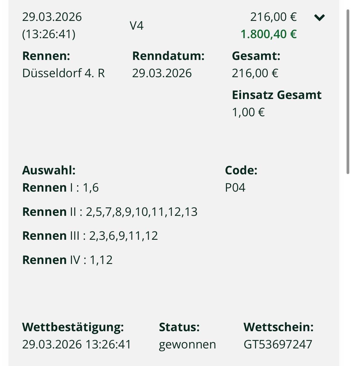 Leider war im letzten Rennen das Zielfoto nicht ganz so für mich Mit der 2 Donatello Face 4% hätte es 5326 € gegeben, das hätte mir besser geschmeckt