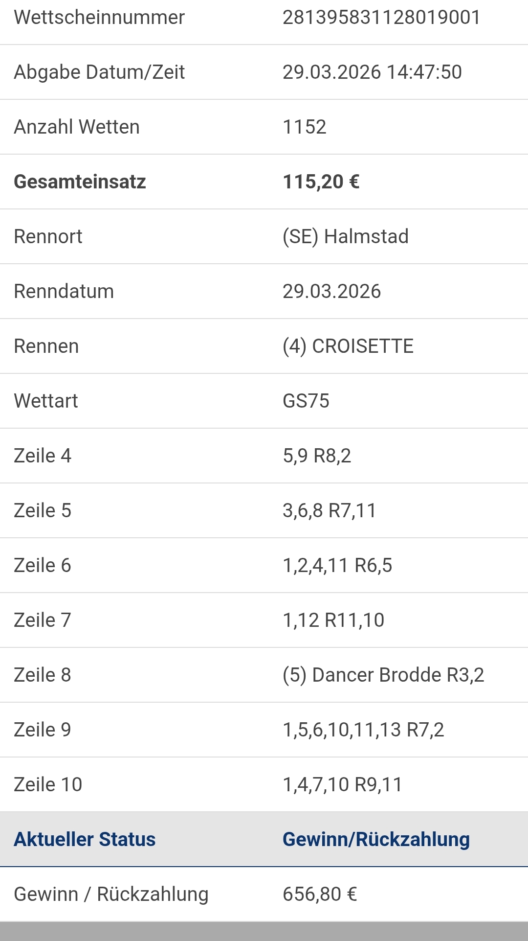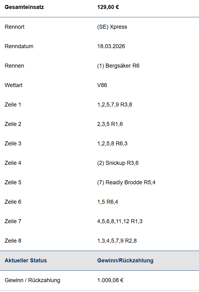 In dem Rennen war eben auch ein wirklicher Streicher C.R. Nobless (11) drin. Am Ende spart sich den jeder. Problem ist nur wenn man einmal mit dem Streichen anfängt, kommt der nächste Streicher.. und schon ist die 10 auch weg vom Schein. Und das letzte Rennen war dann auch mehr ein "Alle" Rennen, wenn man jemanden streichen konnte dann vielleicht die 8 (mit Risiko), aber dann hat man nur den einen und den Fehlenden nimmt man eigentlich mit |