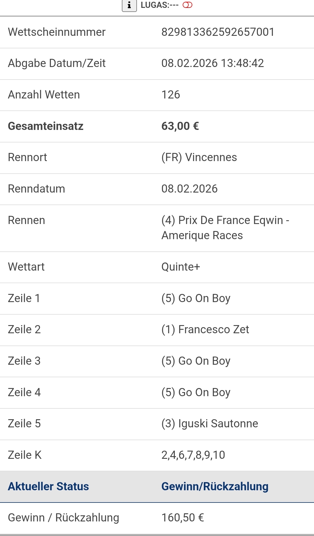 Hatte ja Bock auf den Sieger. Wette nur für kleines Geld. Zehn Sieg und Platz, Zwilling und Drilling aber drin 😊