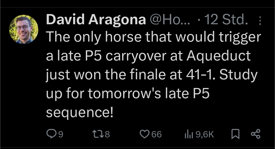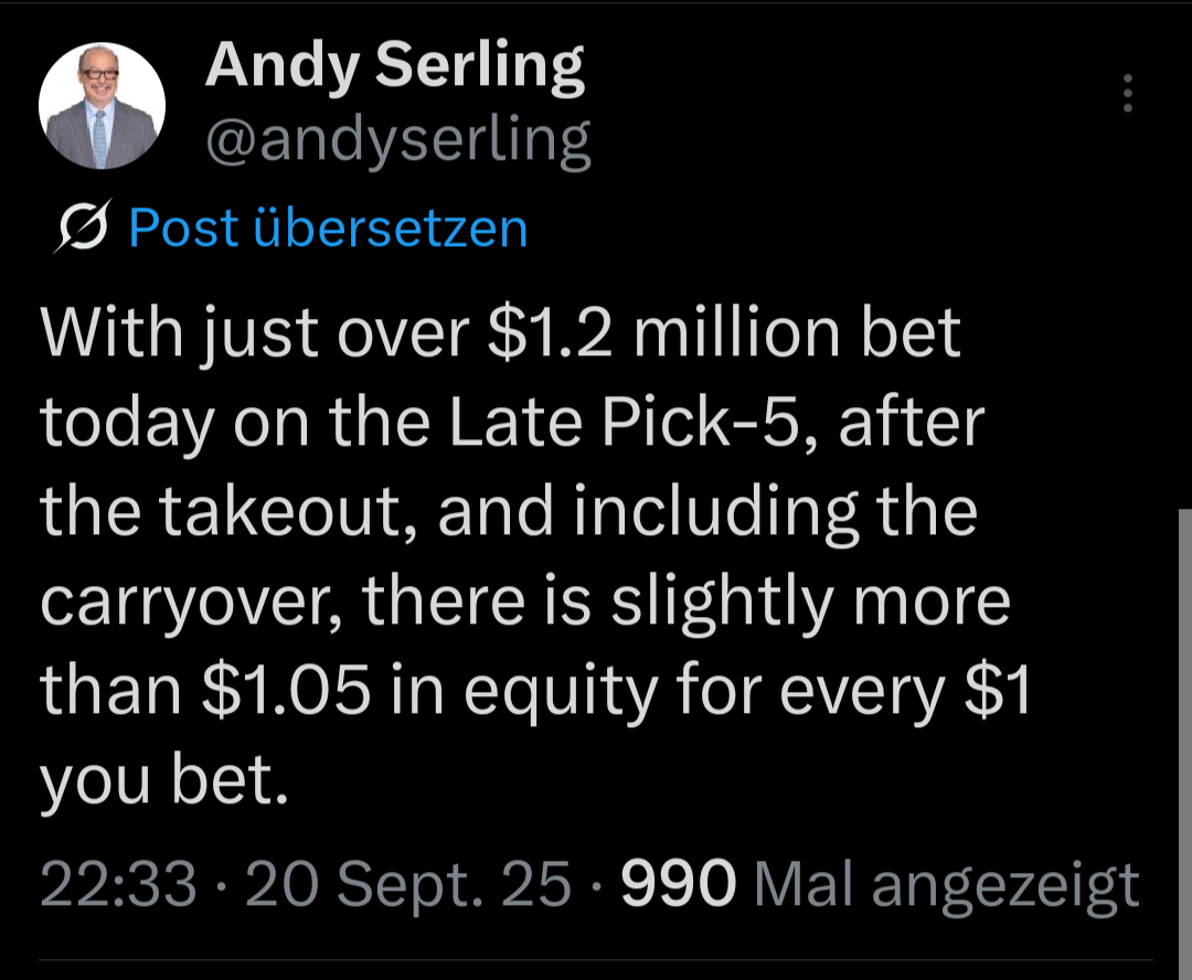 Gerade erfahren das es heute Abend einen Jackpot in der Pick 5 im Belmont Park geben wird in den letzten fünf Rennen ( Late Pick 5 ) ..... Achtung in Höhe von 240.000 $ !!! Warum heute ? ..... weil dieser gestern entstanden ist . Warum die letzten fünf Rennen ( Late Pick 5 ) ? ...... weil es immer so ist !!!! Warum 240.000 $ ? ...... weil das Takeout nur 15 % beträgt . Umsatz wird dann 1.50 Mio $ bis 2.00 Mio $ sein , sage ich mal voraus . Wann lernen die Amis eigentlich das man schauen muß ob ein JP geeignet ist ob er auszuspielen ist ? Das man nicht einfach die letzten fünf Rennen nehmen kann , obwohl man doch überhaupt nicht weiß wie die Starterfelder sein werden . Man nicht weniger Takeout nehmen kann in einer Pick 5 als in der Siegwette . Hoffe richtiger Thread , da ja Jackpot nächsten Wochen und nicht nächster Tag . Möchte keinen Vorwurf bekommen , also schon mal sorry für Themenfremd . Achso in der 1 $ Pick 6 sind auch über 120.000 $ JP ( kurios daran ist , dass es die letzten sechs Rennen sein werden ) . |