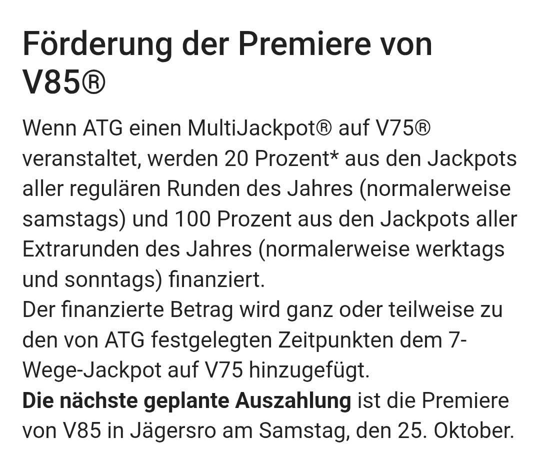 Hat die ATG schon bekannt gegeben, ob der "restliche"JP in der V75 nun komplett am 11.10 ausgespielt wird oder ein Teil in die JP Maschine V85 wandert? Ich finde da nichts aktuelles 🤷♂️ |