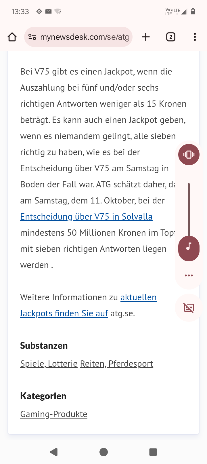 V85 Multi JP ( 25.10. ) muß etwas dazugekommen sein durch die nicht getroffene V75 am Samstag ( für mich immer noch das schärfste , wird jedoch durch die AGB abgesichert sein ) Hier noch mal die neue V85 V85 ersetzt V75 1993 wurde in Schweden die V75 eingeführt und entwickelte sich seither zu einer der größten Erfolgsgeschichten auf dem Sektor der Pferdewette, vergleichbar nur mit der französischen Quinte+ und deren Vorgängern. Die V75 generiert längst mehr Umsatz als Schwedens staatliche Lotterie. Woche für Woche fiebern die schwedischen Wetter und mittlerweile auch viele Zocker außerhalb Schwedens dem Samstag entgegen, wenn die Sieger der Rennen 5 bis 11, die in aller Regel vollbesetzt und hochdotiert sind, vorhergesagt werden müssen. Um auch die "kleinen" Leute mitzunehmen, hat die ATG den Grundeinsatz mit 6 Cent pro Wette bewusst niedrig gehalten. Es gibt drei Gewinnränge für 7, 6 und 5 getippte Sieger. Die V75-Begeisterung steigt erst richtig, wenn der erste Rang unbesetzt bleibt und Jackpots in Millionenhöhe entstehen. Um diese Jackpots zu knacken, gibt es große Tippgemeinschaften mit eigenen Kapitänen. Wer keine Zeit, keine Lust und/oder keine Ahnung hat, greift auf "Harry Boy" zurück, der blitzschnell fertige V75-Systeme für jeden Geldbeutel erstellt. In der jüngeren Vergangenheit stagniert allerdings die Umsatzentwicklung der V75, was die ATG mit Sorge registriert - und jetzt reagiert. Nach einem langen Brainstorming und teilweise kontrovers geführter Diskussion wird nach 32 Jahren aus der V75 eine V85-Wette. Der Startschuss fällt am Samstag, 25. Oktober, auf Schwedens Derbybahn Jägersro - dort, wo 1993 das V75-Märchen begann. Dazu Hasse Lord Skarplöth, der CEO von ATG: "Die V85 markiert den Beginn eines neuen Kapitels, bei dem Schwedens größtes Millionenspiel noch größer wird. Mit V85 können sich Kunden auf drei Mal höhere Quoten als bisher freuen und es wird mehr Gewinner geben." "Einfach ausgedrückt: V85 besteht aus acht Rennen, bei denen man mit acht, sieben, sechs und fünf richtigen Tipps gewinnt. Der Grundeinsatz bei der V85 beträgt 50 Öre (ca. 5 Cent). Hier ist es aber auch möglich, mit einem reduzierten Einsatz und einer entsprechenden Auszahlung zu wetten." „Unter unseren 1,4 Millionen Kunden haben wir sowohl große als auch kleine Spieler. Viele träumen vom großen Gewinn. V85 sollte für jeden etwas bieten. Das Spielen mit einem reduzierten Einsatz ist eine Alternative für Kunden, die ihre eigenen Systeme erstellen und mehr Pferde einbinden möchten, dafür aber einen geringeren Anteil an der Auszahlung im Gewinnfall erhalten möchten“, sagt Hasse Lord Skarplöth. "Der Start von V85 ist der größte in der Geschichte von ATG. Doch es geht nicht nur um die Wette am Samstag. ATG und Svensk Travsport arbeiten nun bis zur Premiere daran, alles zu entwickeln – vom Zuschauererlebnis auf der Bahn über neue Übertragungstechnologie bis hin zu neuen digitalen Spielerlebnissen." "Wir haben ein einzigartiges Produkt im schwedischen Trabrennsport und mit V85 die Möglichkeit, den Samstag weiter zu verbessern – sowohl sportlich als auch publikumswirksam." "Gemeinsam mit der ATG wollen wir das Interesse am Trabrennen steigern, indem wir ein intensiveres Gesamterlebnis sowohl auf der Bahn als auch vor Fernseher, Computer und Handy schaffen. Es geht darum, den Samstag weiterzuentwickeln – ohne das Beste der V75 zu verlieren", sagt Maria Croon, Geschäftsführerin von Svensk Travsport. "Wir wissen, dass die V75 bei unseren Kunden eine beliebte Marke ist. Künftig könnte die V75 an einem anderen Tag und in einem neuen Gewand zurückkehren. Ab dem 25. Oktober wollen wir die V85 jedoch zu einer nationalen Angelegenheit an Samstagen machen", fügt Hasse Lord Skarplöth hinzu. Fakten zur V85 Grundvoraussetzung für die V85 ist die Ermittlung der Sieger in acht Rennen (Gewinn auch bei 7, 6 und 5 richtigen Siegern). Die reguläre V85 wird mit wenigen Ausnahmen jeden Samstag entschieden. Zusätzliche Austragungen finden in der Regel an bestimmten Wochentagen und Sonntagen statt. Preis pro Wette: 50 Öre Wetten mit reduziertem Einsatz: Der Kunde kann seinen Einsatz pro Runde auf ein mathematisches System auf 30 %, 50 % oder 70 % des regulären Einsatzes reduzieren, um den entsprechenden Prozentsatz der Gewinnausschüttung im Gewinnfall zu erhalten. Verteilung auf die vier Preispools: 8 Richtige: 35 % 7 Richtige: 15 % 6 Richtige: 15 % 5 Richtige: 35 % Jackpot-Limit: 5 SEK. Wenn niemand alle richtig hat oder die Gewinnausschüttung in einem oder mehreren Preispools unter 5 SEK liegt, fließt das Geld normalerweise in den Jackpot für die nächste reguläre Runde auf V85. Auszahlung an den Kunden: 65 % - Abzüge: 35 % Annahmeschluss samstags: 16:10 Uhr Aufladung für MultiJackpot: Die Aufladung erfolgt nach den gleichen Grundsätzen wie jetzt für V75 Boost: Es besteht die Möglichkeit, das Boost-Zusatzspiel zu spielen Systembeschränkungen: Max. 5.000 Systeme Premiere: Samstag, 25. Oktober 2025 im Jägersro Spiel mit reduziertem Einsatz: Möglichkeit, den Einsatz auf 30 %, 50 % oder 70 % des regulären Einsatzes zu reduzieren, um den entsprechenden Prozentsatz der Gewinnausschüttung im Gewinnfall zu erhalten. Die Gewinnausschüttung richtet sich dann nach dem gewählten Prozentsatz. Beispiel: 1 Mio. SEK Gewinn beim regulären Einsatz ergibt 300.000 SEK bei 30 % Einsatz, 500.000 SEK bei 50 % Einsatz und 700.000 SEK bei 70 % Einsatz. Das Spiel mit reduziertem Einsatz ist nur für mathematische Systeme verfügbar, mit einem System pro Kunde und Runde und maximal 2.000 Systemen. Das Spielen mit reduziertem Einsatz ist nicht in anderen Spielmodi wie Store Shares, ATG Together, reduzierten Systemen oder beim Spielen mit Harry Boy möglich.