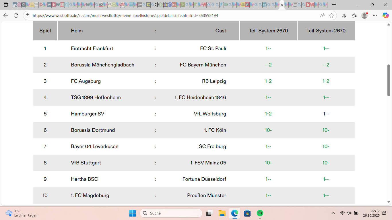 Zwar 13 Richtige mit dem kleinsten System 670 und 2mal 8 Euro Einsatz auf dem Systemschein, aber da Halbsystem wohl 12, 2. rang und damit Peanuts, da 200.000 Jackpot nur bei 13. Leider keine Systembroschüre zur Hand. Chance 1:8. Für 13 wirds wohl noch unterste 4stellig geben, für 12 nocht nicht mal 3stellig. Leider BVB Sieg in der 97. und Stuttgart in der 85. Laß mich überraschen. Aber dafür wenigstens noch 2mal die Daglfinger V6 mit 16 bzw. 72 Euro Einsatz. Da stimmt die Rendite.