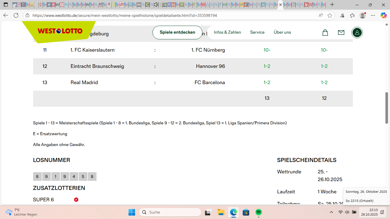 Herzlichen Glückwunsch hat Westlotto mir geschrieben, zu natürlich nur 12 Richtigen. Aber bei noch nicht mal 4stellig, sondern knapp 800 Euro im 1. Rang, da schmerzt es auch nicht so sehr, wenn das System nicht hinkommt. |
