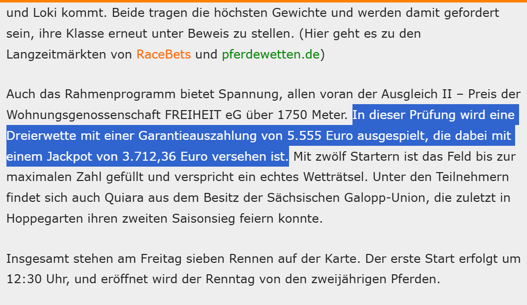 KillerQueen schreibt: Wäre als Co gerne dabei, alleine würde ich es zeitlich kaum hinbekommen, es sind immer noch 97 Starter bei 8 Rennen,,,,, d.h unzählige Replays, Infos usw. Und wir haben schon Mittwoch.🫣 Wüsste im Moment auch nicht, wie man aufbauen könnte, meine möglichen Bankpferde tummeln sich fast alle in der 2. Reihe,,,,, und über System wird's ja utopisch teuer, bei 5 CT pro Reihe ohne große Kürzungen 🙄.