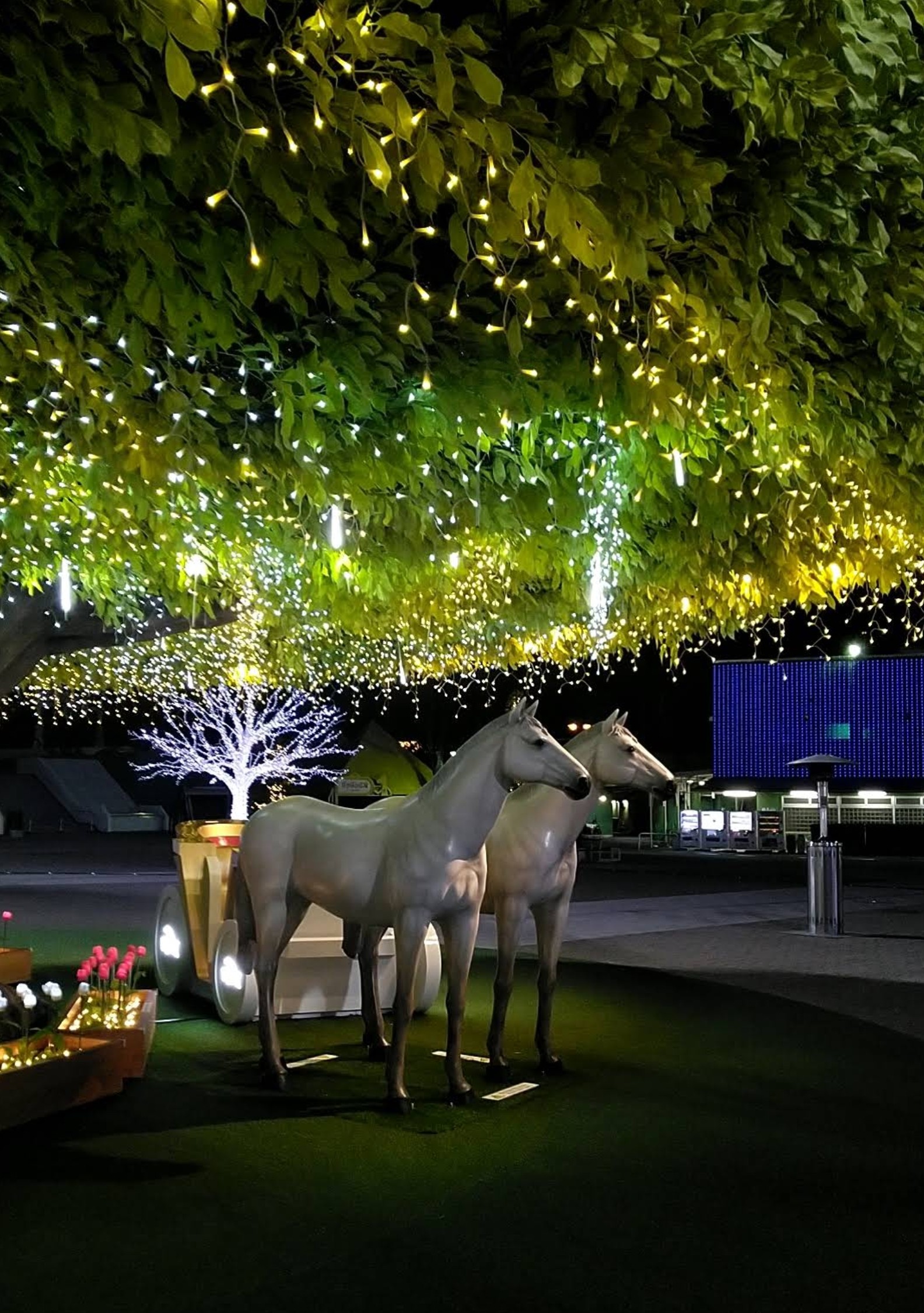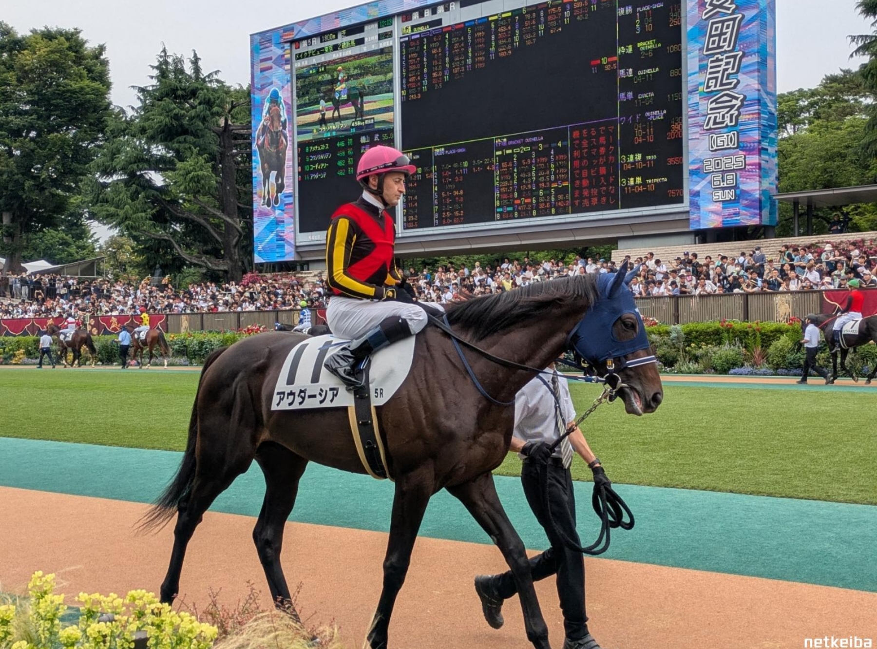 Nakayama racecourse hat die ersten schon vor Std. auf die Bahn gelassen wegen Nieselregen. Jetzt warten die stundenlang vor dem finalen Tor auf den gleichen Run wie zum Elitloppet. Aktuell -1⁰ Und Pic von gestern. Wer sich in der Vergrößerung über die Animation in Richtung Infield auf der Led Wand wundert... Infield auf allen JRA Bahnen ist Kindergarden, Spielplatz, Streichelzoo mit Ponyreiten. Die Rennen, gestern Hindernis werden im Stofftier (Plushie Modus) animiert. Und die Innenbahn ist Picnicwiese. Jeder kann selber seinen Verzehr mitbringen und das Equipment in Schließfächern lagern. |