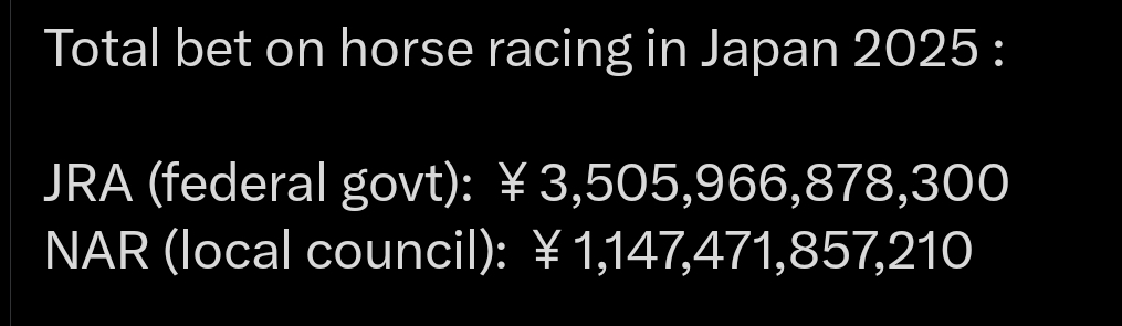 Es gab aber auch keinen Renntagsumsatz der dem nahekommt. Ca. 350mio USD wurden am Kentuky Derby Day ereicht. Das weckt natürlich Begehrlichkeiten. Außer der Steuer verlangt der Staat jetzt umsatzunabhängig 50mio Abgabe. Erstmal zeitlich begrenzt auf 4 Jahre 🤤 Eine deutsche Kolumnistin schrieb nach ihrem Japan Cup Besuch in der Turf Times die JRA würde unter der Fuchtel des Staat stehen. Ich nenne es eher Schutz. Und die Sonderabgabe Schutzgeld. Natürlich möchte die JRA gerne mehr Rennen abhalten. Ab der Staat, besonders bei diesen Summen braucht auch eine Legitimation für sein Glückspiel Recht. Der Staat kanalisiert das Glücksspiel in nur 3 Rennnsportarten von denen nur der Pferdesport inteernational ist, ohne Sportwetten und eine eigene Lotterie nur an 5 Tagen jährlich. Für den Pferderennsport ein traumhafter Status Quo den man nicht gefährden sollte. Es kann auch in Japan kein unbegrenztes Wachstum geben, mehr Rennen bedeutet nicht das mehr Geld zur Verfügung steht. Außerdem gibt es die NRA deren Wochenrenntage auf den kleineren Sand Fluchtlichtbahnen umsatzmäßig noch Luft nach oben haben. Die haben im jetzigen Hype erhebliche Steigerungen. Sylvester wurde in Funabashi nach den Rennen mit Drohnenshow reingefeiert. Ausverkauft. |