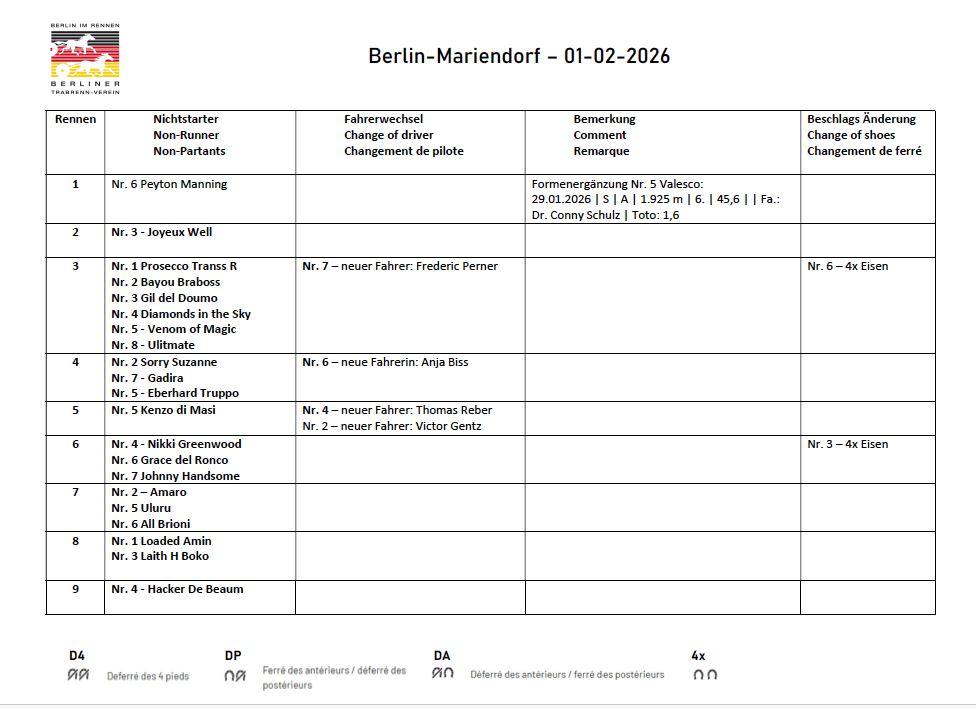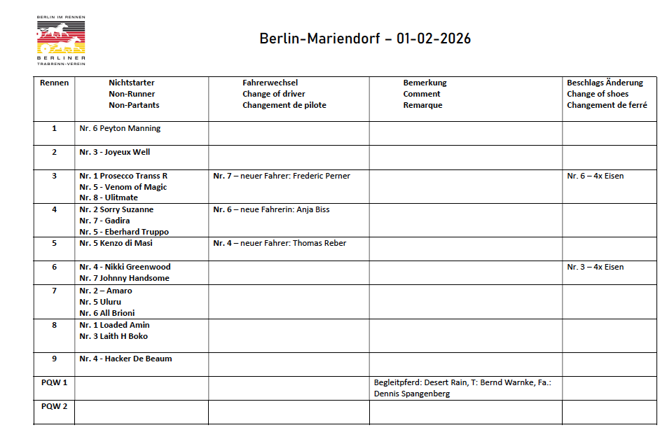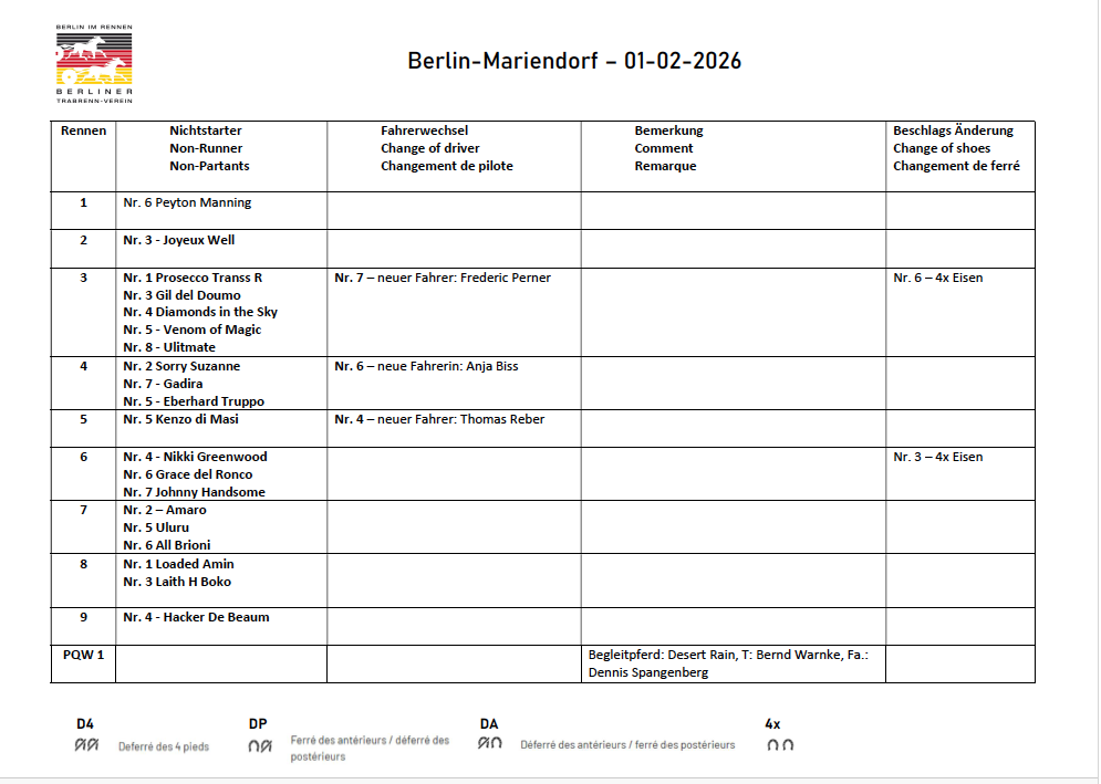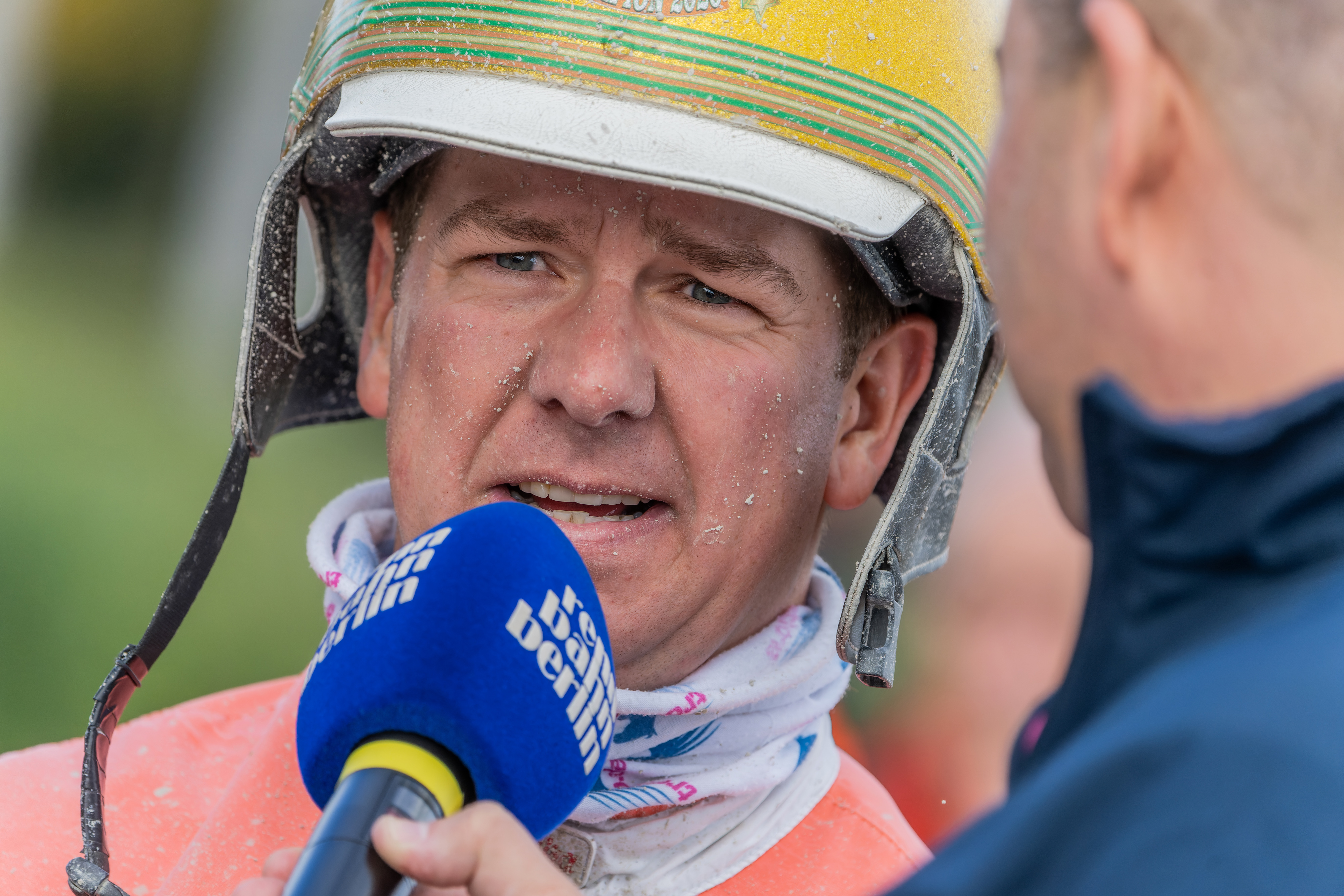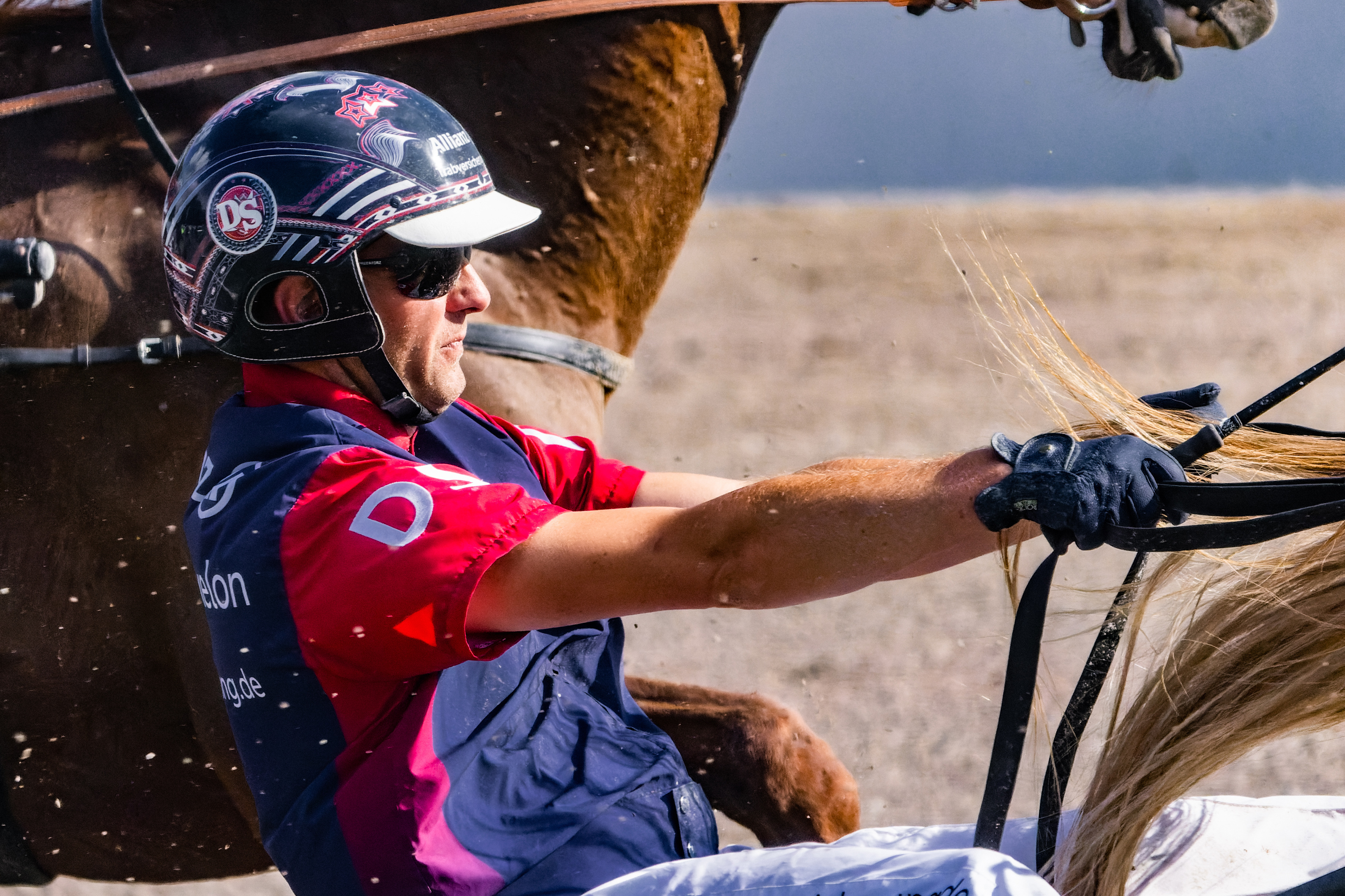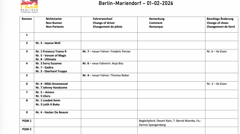 „Hier fahre ich für Thorsten Tietz Maharani GB. Ich gehe davon aus, dass die Stute gut vorbereitet an den Ablauf kommt. Der Gegner ist Foxtrot Jet und unter uns beiden wird der Sieg entschieden werden.