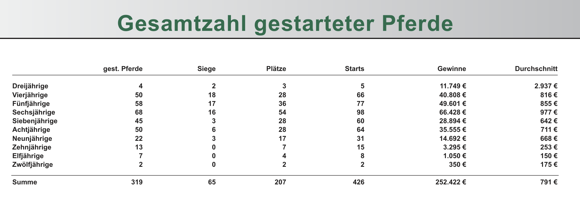 Das ist die Statistik der gestarteten Pferde aus dem letzten TRK. Befasst man sich nicht genauer mit den Zahlen dann möchte man meinen, dass sich das ja gar nicht so schlecht liest. Immerhin hat ja jedes Pferd im Schnitt 791 Euro verdient. Hier sind aber nicht die in Deutschland gestarteten Pferde aufgeführt, sondern alle beim HVT registrierten Pferde. Hier wurden also auch die Pferde, die im Ausland gestartet sind dazugezählt. Anders sieht es aus, führt man in dieser Statistik nur die in Deutschlang gestarteten Pferde auf: