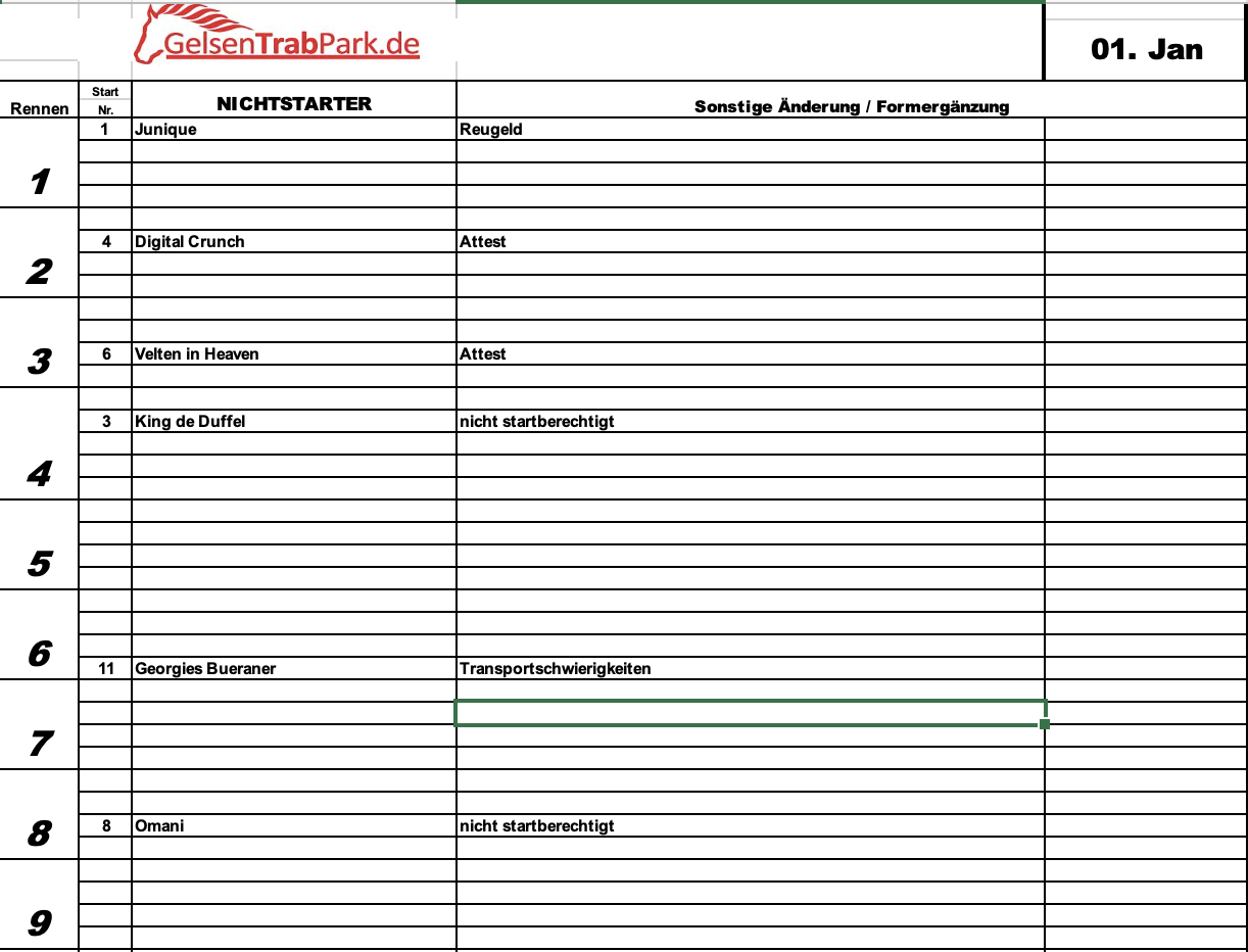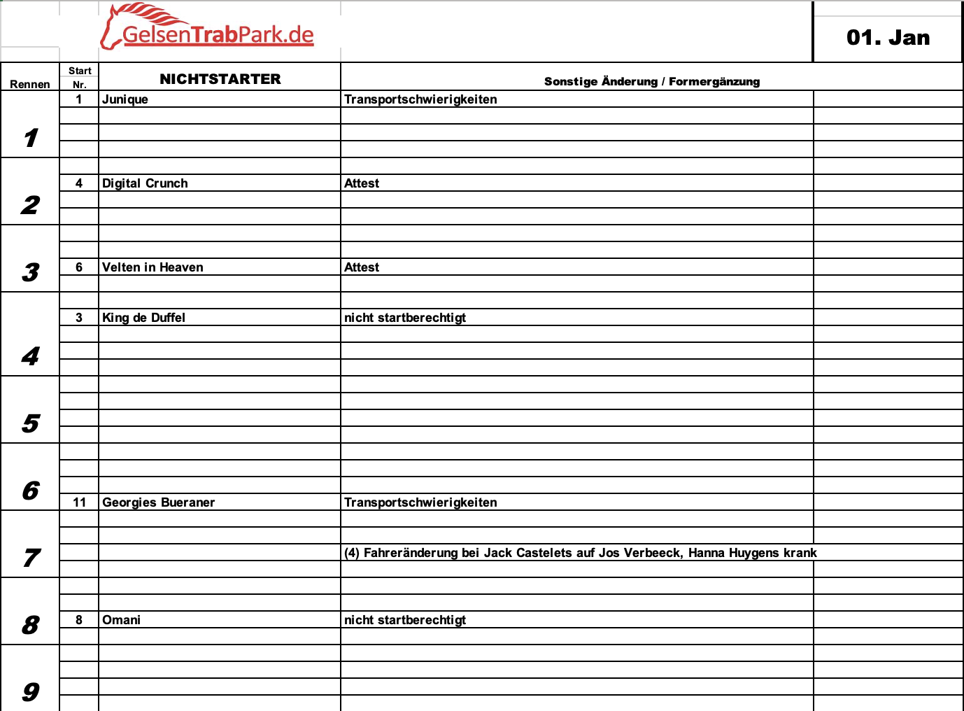 Der GelsenTrabPark wünscht allen Besuchern, Aktiven sowie allen Mitarbeiterinnen und Mitarbeitern der Trabrennvereine ein gesundes, erfolgreiches und sportlich spannendes Jahr 2026. Wir freuen uns auf einen stimmungsvollen Neujahrstag und einen gelungenen Auftakt in die neue Trabersaison. Start ins Rennjahr 2026: Junique zeigte sich in Berlin bereits bestens aufgelegt, und der dritte Platz bedeutete gleichzeitig einen neuen Rekord. Mit dieser Form wird die Stute sicher gefördert an den Ablauf gelangen. Purple Flevo bleibt ein ernstzunehmender Gegner, sein Sieg im Park ist noch in bester Erinnerung. Peregrin Boko, gesteuert von Jos Verbeeck, zeigt eine klare Aufwärtskurve. Olivander Mac gilt normalerweise als Muster an Zuverlässigkeit – umso überraschender war der letzte Ausrutscher. Little Nellie wirkt aktuell etwas unkonzentriert, während Onyx Meadow deutlich über Taicano steht.