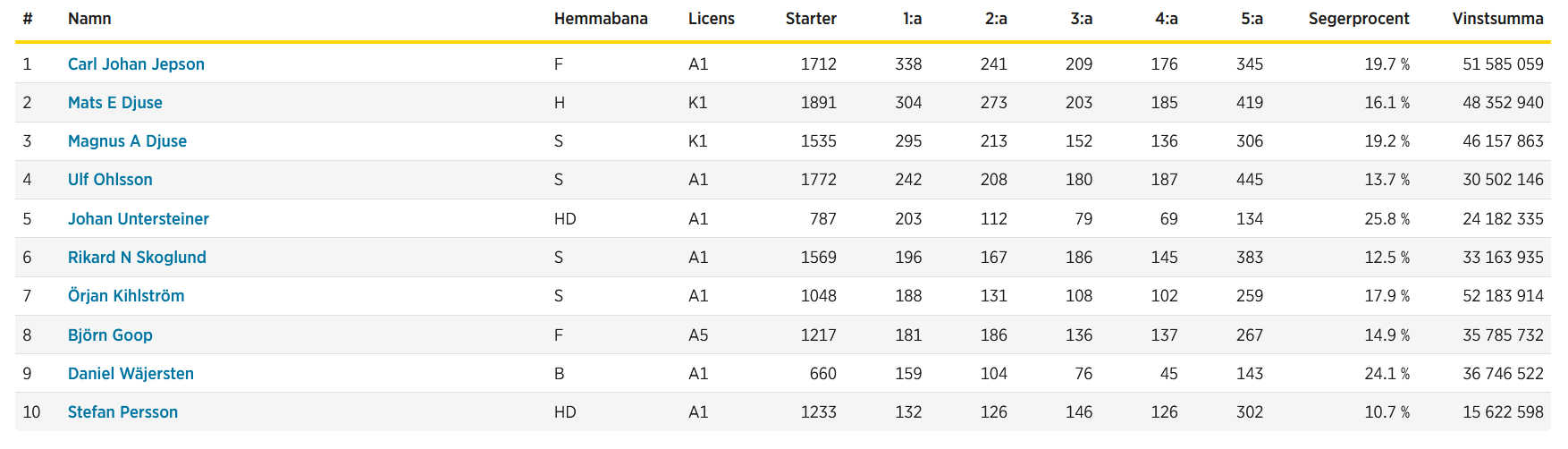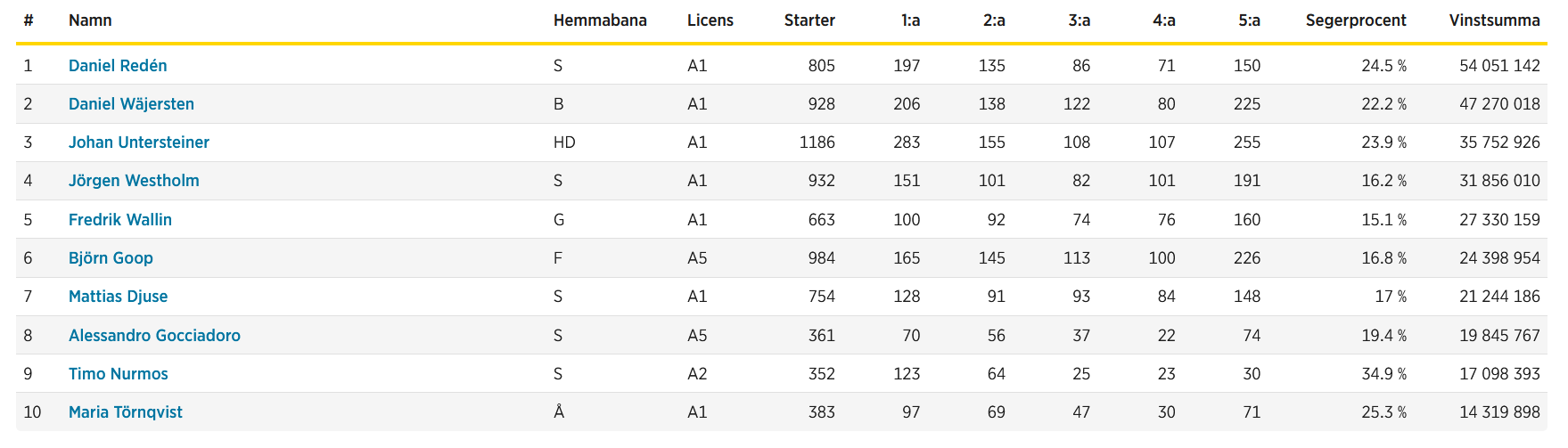 Endstand im schwedischen Fahrer- und Trainerchampionat: