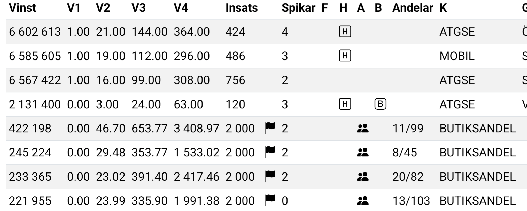 Heute mal wieder 2 der 3 Treffer in der V85 durch Harry Boy. Und der viertgrößte Gewinn durch Harry Boost. Nahezu alles andere für 7 Richtige (eine Ausnahme) überzeichnete Butiksanteile. Chance für Einzelspieler auf einen guten Gewinn nahezu nicht existent. Es lebe die V85.