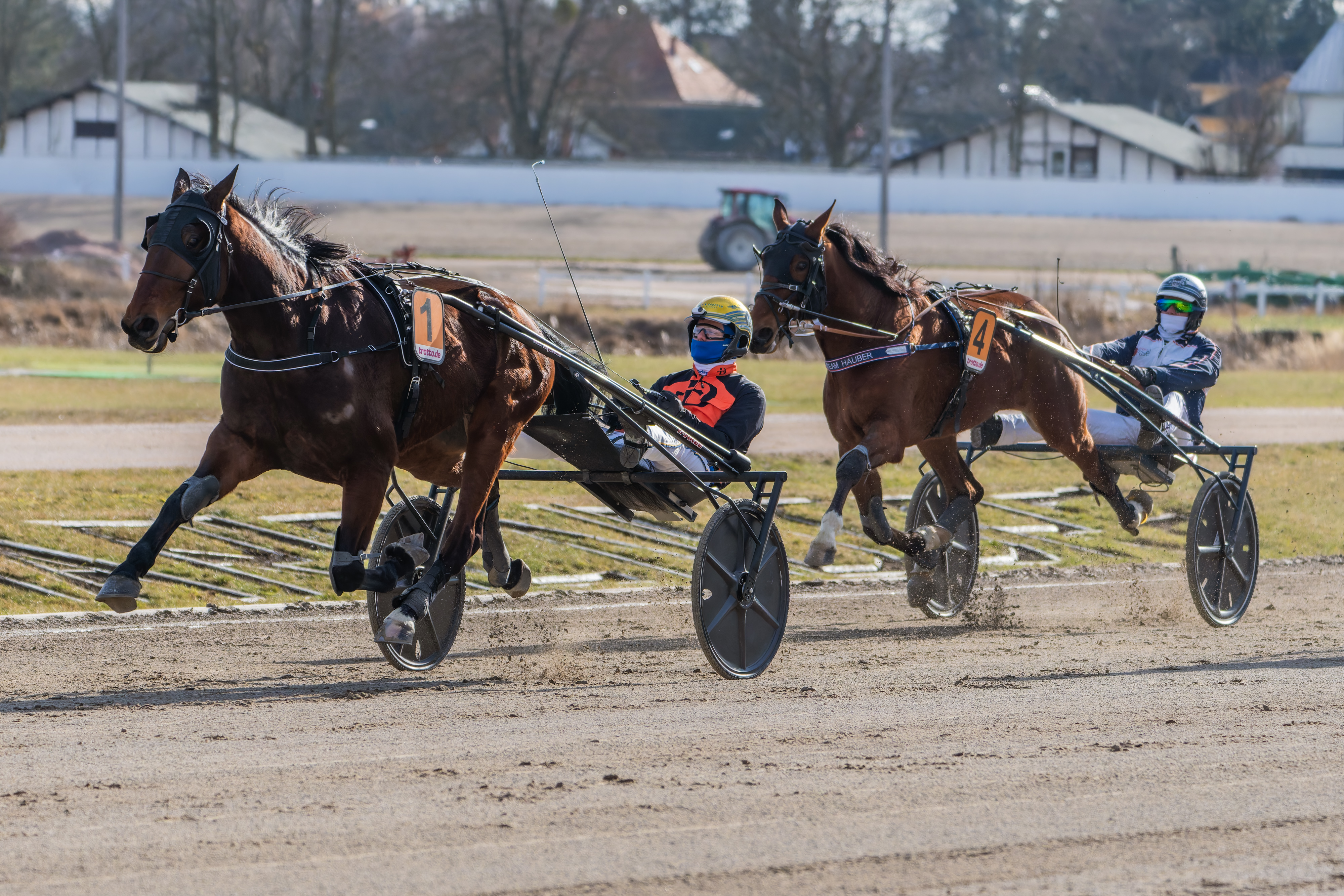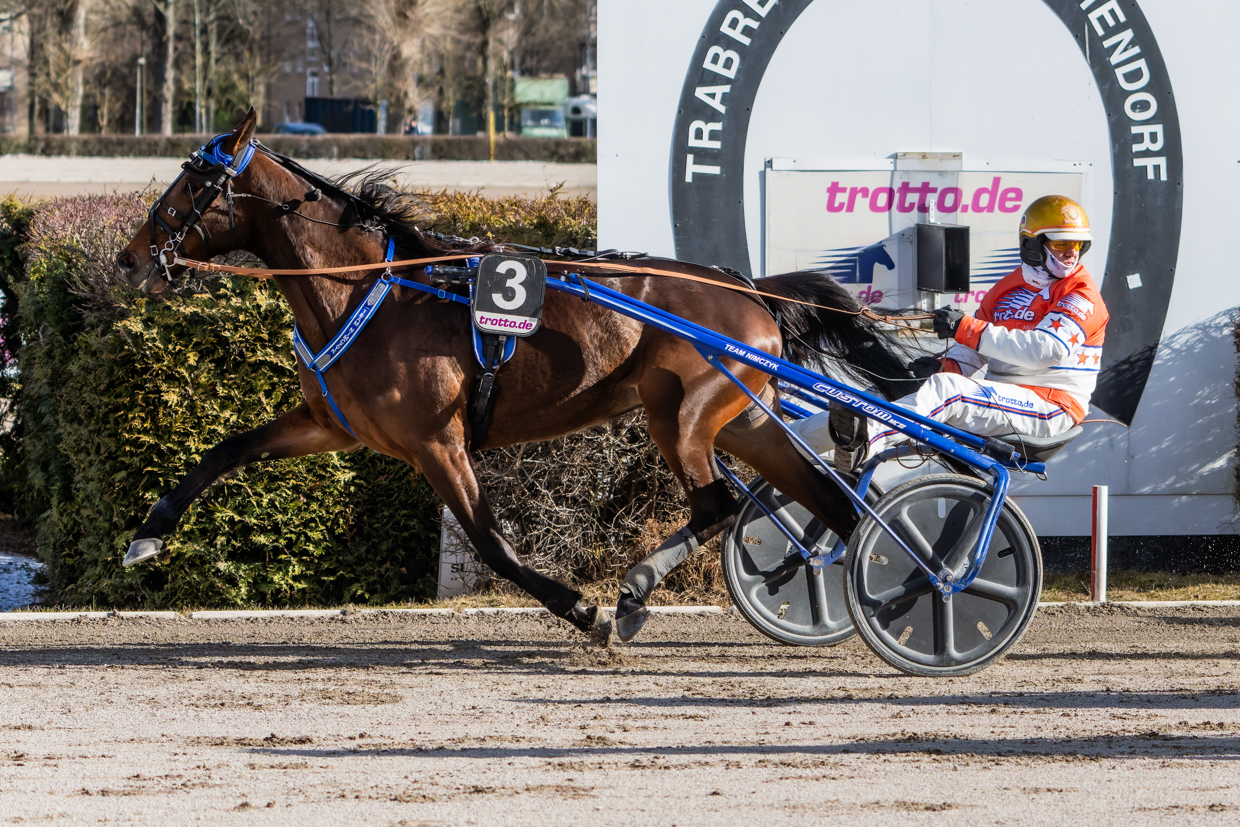 Fahrer-Double für Christoph Schwarz und Jaap van Rijn Nachschau Mariendorf, Sonntag, 15.02.2026 Richtig guten Trabrennsport bekamen die Zuschauer bei der PMU-Matinée am Sonntagmorgen bei kühlen Temperaturen und strahlendem Sonnenschein in Mariendorf zu sehen. Mit dem ersten Lauf zur Silber-Serie stand neben den üppig dotierten PMU-Rennen auch das erste Standardrennen der Saison 2026 auf dem kurzweiligen Sechs-Rennen-Programm. Wenn in Mariendorf mehrere gleich starke Pferde aufeinandertreffen, dann entscheiden oft die Startnummer und die beste Taktik über Sieg oder Niederlage. So auch heute im ersten Lauf zur Silber-Serie, den sich South Carolina AS und Michael Nimczyk sicherten. Die International-Moni-Tochter bekam die Führung eingangs des ersten Bogens vom Stallgefährten Take Five (Robbin Bot) auf dem Silbertablett serviert und durfte dann ungestört ein sehr ruhiges Tempo an der Spitze anschlagen. Eingangs der letzten Überseite legte sich Take Five an die Seite seiner Stallgefährtin und wartete gemeinsam mit ihr auf die Attacken der Konkurrenz. Diese kamen dann Ende der Gegenseite in erster Linie von Olympia Greenwood (Christoph Schwarz), die bei nun höllischer Fahrt den gesamten Schlussbogen in der dritten Spur zurücklegte und trotz des enormen Pensums den diesmal sehr gut durchziehenden Othello PS (Victor Gentz) auf Rang drei verwies. Für den Sieg war die Messe da allerdings längst gelesen, denn South Carolina AS hatte sich im Schlussbogen umgehend vom Feld gelöst und konnte auf den finalen Metern locker austrudeln. Dabei genügten der Sechsjährigen eher langsame 1.16,1 / 1.900 m, um das erste fünfstellig dotierte Trabrennen des Jahres in Deutschland zu gewinnen. Da war sogar Pam Beuckenswijk (Jaap van Rijn) mit 1.15,7 als turmhoch überlegene Siegerin des ersten Laufes der Newcomer-Serie in der gehobenen Anfängerklasse fast eine halbe Sekunde flotter unterwegs. Die Schilstra-Stute übernahm ausgangs des ersten Bogens die Führung von Mateo KS (Christoph Fischer) und dominierte die Konkurrenz anschließend nach Belieben. Mateo KS verteidigte den zweiten Platz knapp vor dem speedigen Gigio Effe (Kevin Brunner).