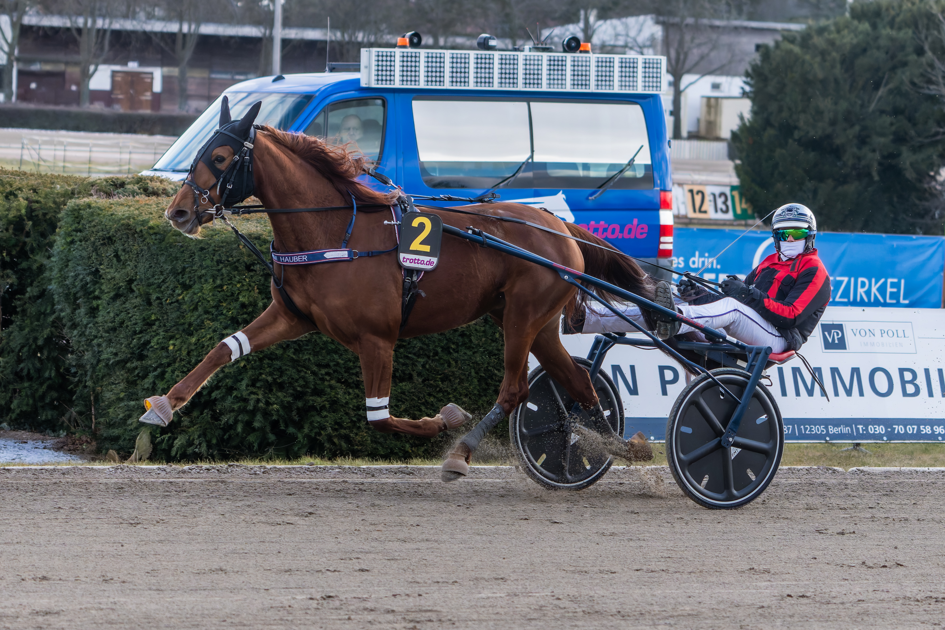 Auch Christoph Schwarz dürfte zufrieden die Heimreise nach München angetreten haben. Denn auch dem deutschen Silberhelm gelang eine Doublette. Mit der von Marcel Hauber trainierten Pebbles Stone übernahm er im zweiten Rennen vor den Tribünen das Kommando von Eternity (Victor Gentz) und hatte dann am Ende überhaupt keine Probleme, den wuchtigen Schlussangriff von Njord Invicta (Michael Nimczyk) souverän zu kontern und einen überlegenen Erfolg zu erzielen. Eternity nutzte die kurzen Wege zu Rang drei. Den zweiten Volltreffer errang Christoph Schwarz dann für das eigene Quartier, den Stall Gramüller. Mit dem Mariendorfer Dauergast Foxtrot Jet orientierte sich der gebürtige Österreicher eine Runde vor Schluss an die Seite des führenden Narthex Boko (Michael Nimczyk) und drehte dann kontinuierlich an der Temposchraube. Unter diesem Druck geriet Narthex Boko eingangs der Zielgeraden von den Beinen, woraufhin sich Foxtrot Jet umgehend der Schlussattacke der geschonten Tampa Bay (Josef Franzl) ausgesetzt sah, die aber trotz aller Bemühungen nicht an dem immer wieder anziehenden Italiener vorbeikam. Weit zurück war All Brioni (Dennis Spangenberg) der Tapferste der „zweiten Abteilung“. Schon vor dem Start der Rennen war klar, dass die Berliner Trainer an diesem Tag einen sehr schweren Stand haben würden. Die einzige echte Siegchance für die ostdeutschen Quartiere war im Vorfeld der Franzose Kaporal du Houssel mit Trainer Victor Gentz, der im ersten Rennen über den langen Weg von 2.500 m antrat. Der Sieburg-Traber war im ersten Band perfekt positioniert und lieferte auch die erwartet starke Leistung ab. Dass es am Ende dennoch nicht reichte, dafür waren Indigo des Baux und Robbin Bot ungeachtet einer Zulage von 40 m verantwortlich. Das Gespann vom Kaiserhof setzte am Start alles auf eine Karte und war bereits im ersten Rosenhof-Bogen in die zweite Position hinter dem vorne ein durchweg flottes Tempo diktierenden Kaporal du Houssel gerückt. Als dann Henri de Jautais (Josef Franzl) auf der letzten Überseite die Gänsemarsch-Formation auflöste, ging auch Indigo des Baux in die Offensive und setzte den Piloten unter Druck. In einem packenden Endkampf hatte der Fuchs aus dem Nimczyk-Quartier knapp das bessere Ende gegen den nie aufgebenden Gentz-Traber für sich. Auch der Drittplatzierte Henri de Jautais vermochte in diesem sportlich sehr hochwertigen Franzosen-Rennen absolut zu überzeugen. Totofavorit Iathenus Day (Christoph Fischer) überging sich leider in der Startphase und hatte dann, auspariert, in dieser Konkurrenz keine Chance mehr.