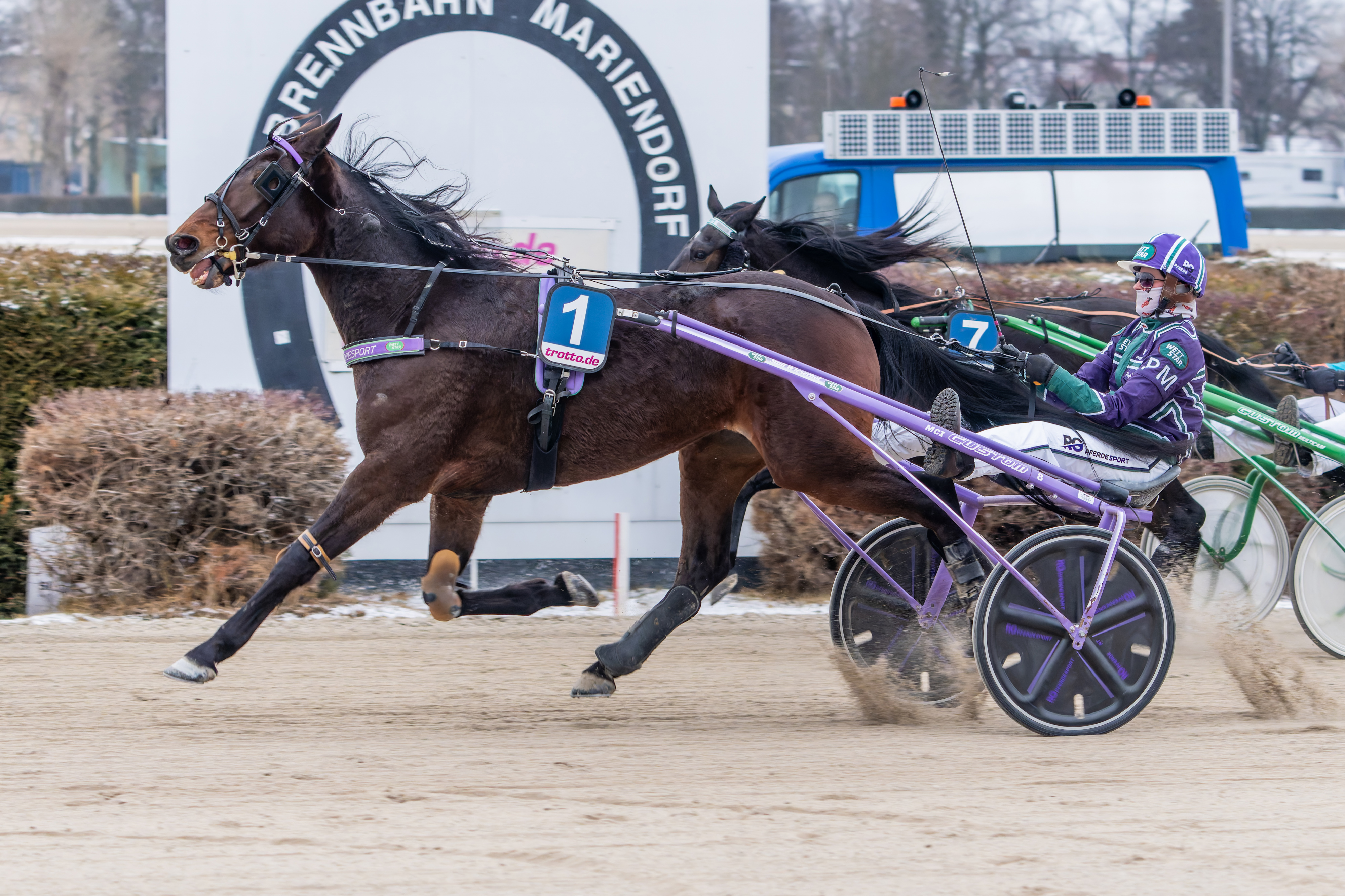 (hhü) Einen absoluten Sahnetag hatte das Team Gramüller an diesem durch enorm viele Nichtstarter geprägten Renntag in Mariendorf. Nicht weniger als vier Siege gingen dabei auf das Konto der Münchner. Einziger Wermutstropfen für das Team Lila war der Auftritt von Ultrafavorit Valesco (Ronja Walter), der sich bei seinem Debüt im Trabreiten nicht für das neue Metier begeistern konnte und eingangs der ersten Tribünengeraden entscheidend von den Beinen kam. Nutznießer des Ausfalls waren einmal mehr Chamarel Wibb und Maja Unterdörfer, die sich erneut von Ina Gual (Hannah Schmitz) den Weg weisen ließen und dann im Einlauf die Pilotin locker einkassierten. Auf Rang drei überraschten Riven und Fabienne Margies.