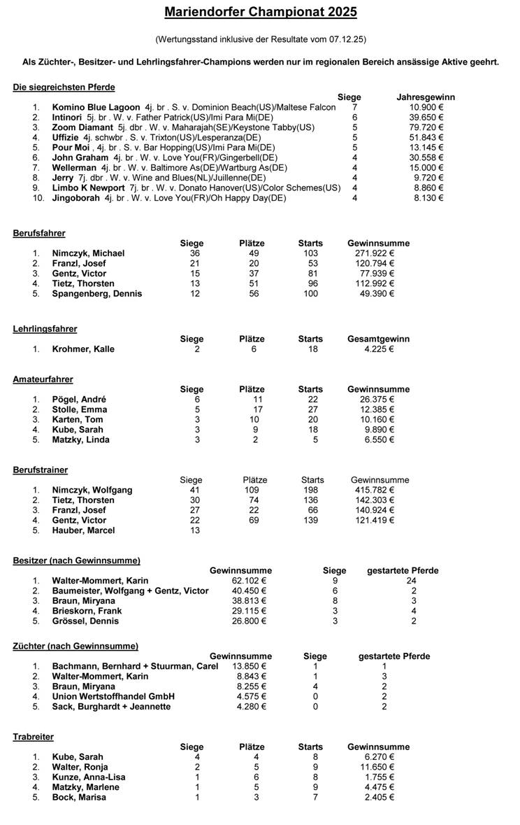 In einigen Meisterschaftssparten stehen die kommenden Titelträger, die am 18. Januar 2026 im Rahmen der Mariendorfer Veranstaltung im Winner-Circle geehrt werden, aufgrund ihres uneinholbaren Vorsprungs bereits fest. Aber in anderen Rubriken ist mit einem Millimeterfinish zu rechnen. Den augenblicklichen Wertungsstand (inklusive der Resultate vom 7. Dezember) finden Sie untenstehend bzw. als beigefügte Datei.