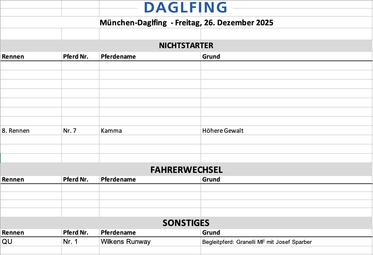 Mit acht Rennen ab 14:00 Uhr verabschiedet sich München Daglfing aus der Saison 2025 und bietet als sportliches Highlight den Wettstar.de – Daglfinger Weihnachtspreis – Preis des Bayerischen Staatsministeriums für Ernährung, Landwirtschaft und Forsten. Mit 6.000 EUR dotiert, führt Daglfings letztes Highlight der Saison 10 Starter aus zwei Bändern zusammen, die sich ein hitziges Duell liefern sollten.