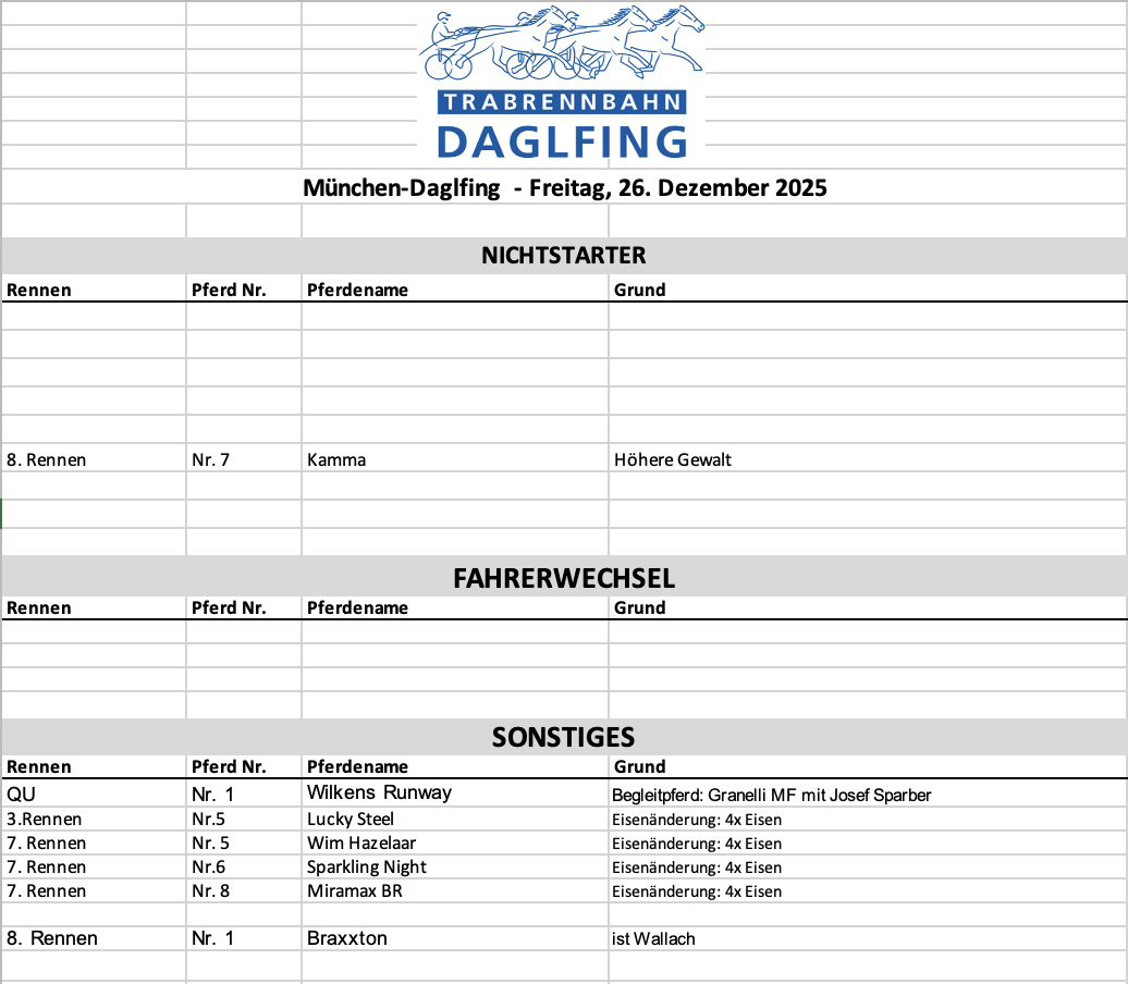 Wir freuen uns auf einen schönen Weihnachtsrenntag und damit auch den Abschluss der Saison 2025! Wir freuen uns auf spannende Rennen, guten Wettumsatz und viele Zuschauer, die insbesondere auch bei der Ehrung der Bahnchampions zahlreich am Winnerscircle die Daglfinger "Stars" feiern 🏆🍾 Ein großes Dankeschön an das gesamte Team vom Sulky-Treff für die überragende Arbeit in den letzten Jahren - sie werden uns sehr fehlen 🥺🫶🏻 Aber auch ein großes Dankeschön an Familie Reber / Traberstadl und Familie Pangerl/Willis Futterkiste für eine kulinarisch sehr gute Saison ☺️