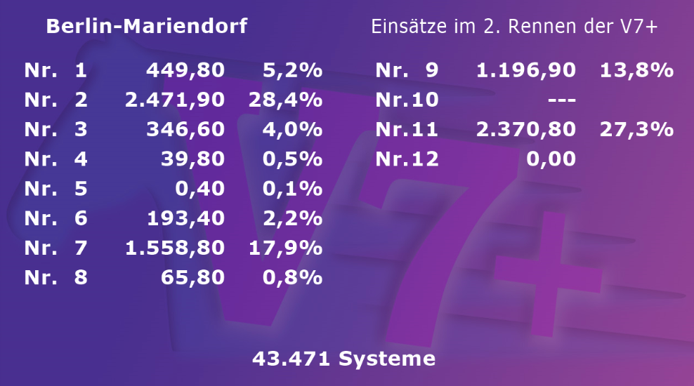 Fifi b.G. schreibt: Mit dieser Vermutung hat er nicht ganz unrecht. Im Pot war der Umsatz von gestern: 61.653.- Euro In Stream ist es zu verfolgen, dass es nach dem 5. der V6 noch 159 lebende System gab. Dad bedeutet dann, da 4 Systeme nicht mit einem anderen Pferd als Desiderio gespielt waren. Selbst wenn alle vier restlichen Scheine Ocean Eyes gespielt hatten, gäbe mindestens 11.432 Euro (45.730/4). Bei nur dreimal Ocean Eyes wäre es schon 15.243 Euro gewesen. |