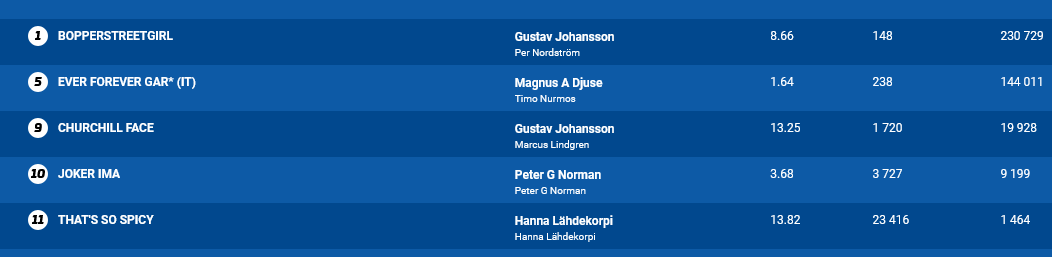 Eigentlich wollte ich nach dem Beruf von Peter G. Norman fragen, weil ich befürchtete, dass er uns schon wieder ein Rennen kaputt fährt. Hat zu seinem Glück aber gewonnen als "A-Pferd". |