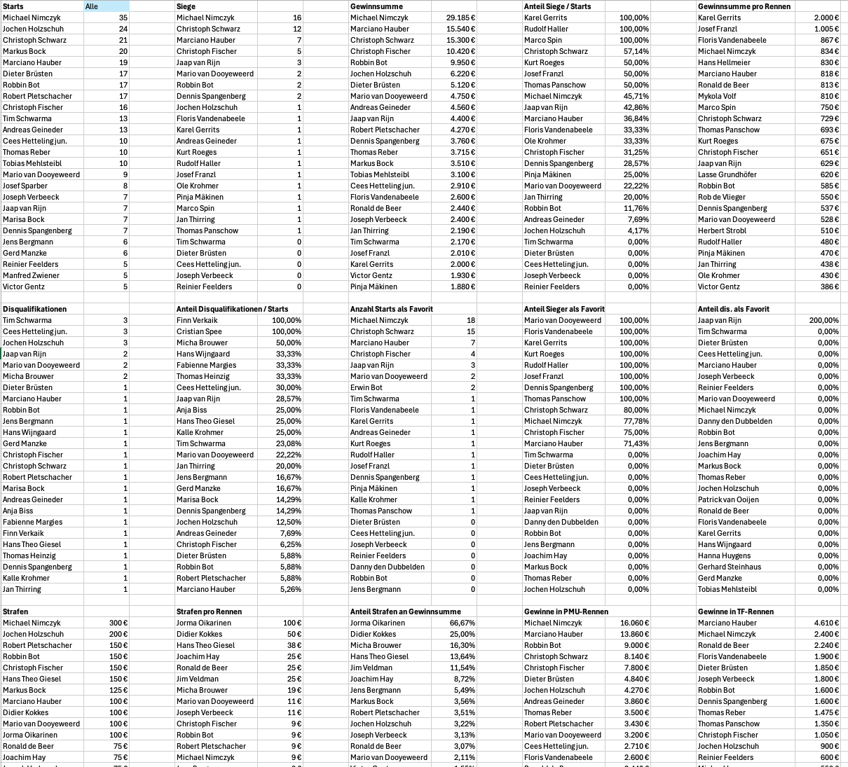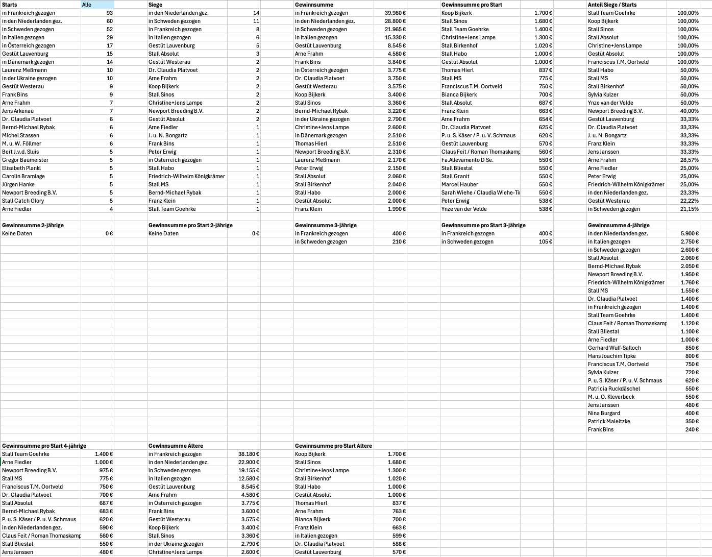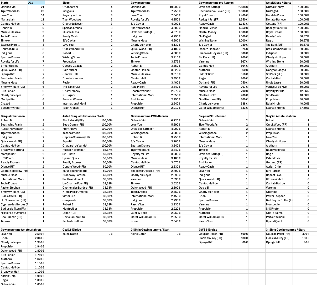 Hallo zusammen, zu meinen Steckenpferden gehört es, Statistiken zu erstellen. Für Menschen wie mich – und ich oute mich da gern – gibt es kaum etwas Objektiveres als Zahlen. Umso enttäuschter bin ich, wie wenig belastbare Zahlen und Statistiken in unserem Sport tatsächlich zur Verfügung stehen. Ich habe mir deshalb ein Excel-Tool gebaut, das eingetippte Rennberichte verarbeitet und daraus verschiedene Statistiken generiert. Wichtig zum Verständnis: Mich interessieren zunächst ausschließlich Rennen auf deutschen Bahnen, Auslandsstarts sind aktuell bewusst nicht berücksichtigt. Da man bei solchen Projekten schnell betriebsblind wird, würde ich mich in dieser frühen Phase sehr über Input von außen freuen. Deshalb meine Frage an euch: Welche Statistiken wären für euch relevant – ganz gleich, ob aus Sicht von Wetterinnen und Wettern, Besitzern, Züchtern oder auch einfach als interessierte Beobachter? Anbei habe ich einige Beispiele für 2026 beigefügt. Berufsfahrer-Statistik Top25