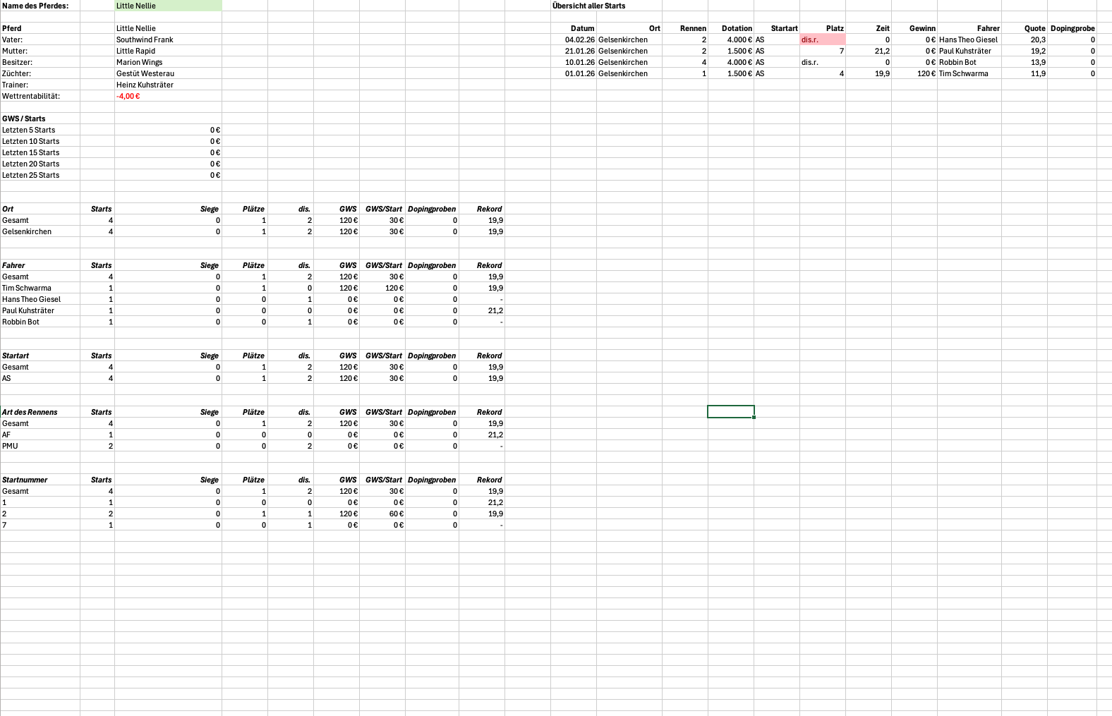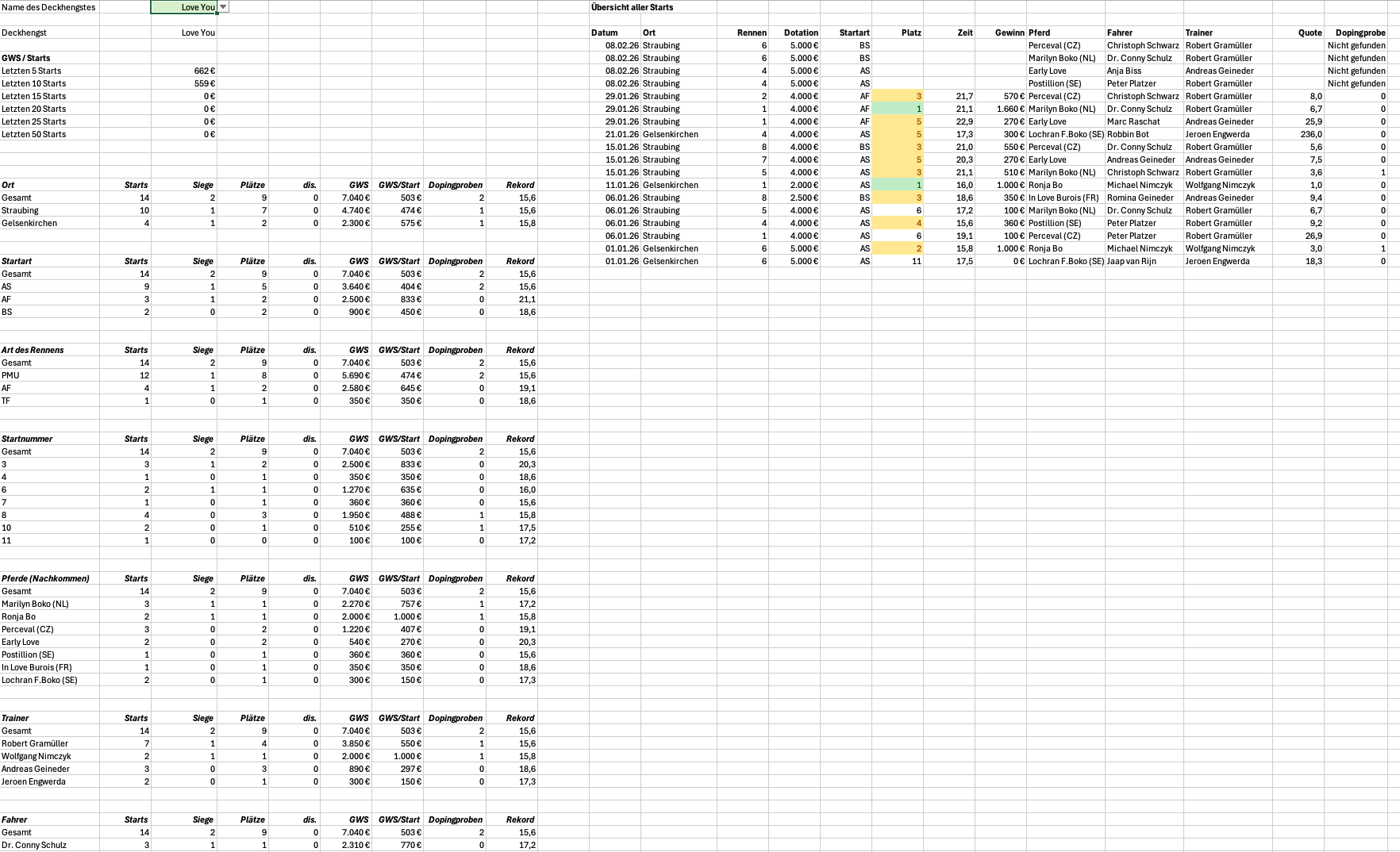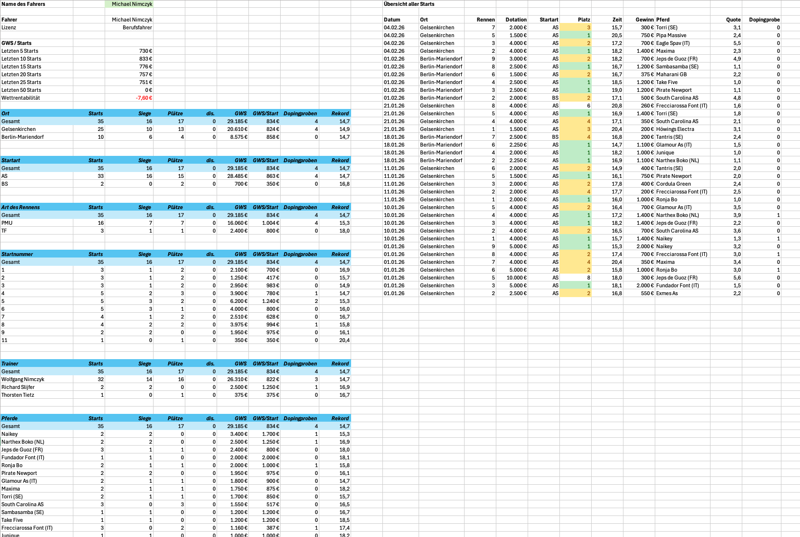 Hallo zusammen, zu meinen Steckenpferden gehört es, Statistiken zu erstellen. Für Menschen wie mich – und ich oute mich da gern – gibt es kaum etwas Objektiveres als Zahlen. Umso enttäuschter bin ich, wie wenig belastbare Zahlen und Statistiken in unserem Sport tatsächlich zur Verfügung stehen. Ich habe mir deshalb ein Excel-Tool gebaut, das eingetippte Rennberichte verarbeitet und daraus verschiedene Statistiken generiert. Wichtig zum Verständnis: Mich interessieren zunächst ausschließlich Rennen auf deutschen Bahnen, Auslandsstarts sind aktuell bewusst nicht berücksichtigt. Da man bei solchen Projekten schnell betriebsblind wird, würde ich mich in dieser frühen Phase sehr über Input von außen freuen. Deshalb meine Frage an euch: Welche Statistiken wären für euch relevant – ganz gleich, ob aus Sicht von Wetterinnen und Wettern, Besitzern, Züchtern oder auch einfach als interessierte Beobachter? Anbei habe ich einige Beispiele für 2026 beigefügt. Berufsfahrer-Statistik Top25