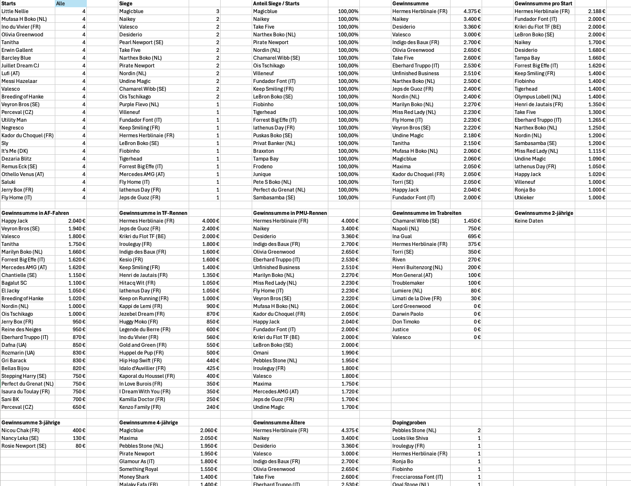 Christina Hempel schreibt: Danke, zumindest für D erst einmal für mich ein guter Ansatz. Derzeit schon möglich ist mir diese Statistik für Fahrer, Trainer, Pferd und Deckhengste (So sinnvoll es hier auch sein mag, war aber datentechnischer Beifang). |