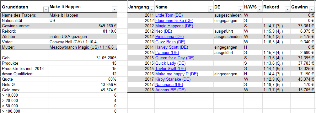 Am störendsten finde ich, dass die Statistiken von ausländischen Pferden nicht vollständig in der HVT-Datenbank erscheinen und ausländische Starts nicht immer in der Übersicht enthalten sind. Den Anteil der Disqualifikationen finde ich auch relevant und die Daten liegen vor, man müsste sie nur in der Übersicht entsprechend aufbereiten. Für mich als Wetter sind übrigens am relevantesten die durchschnittliche Gewinnsumme je Start und der Anteil gewonnener Rennen. |