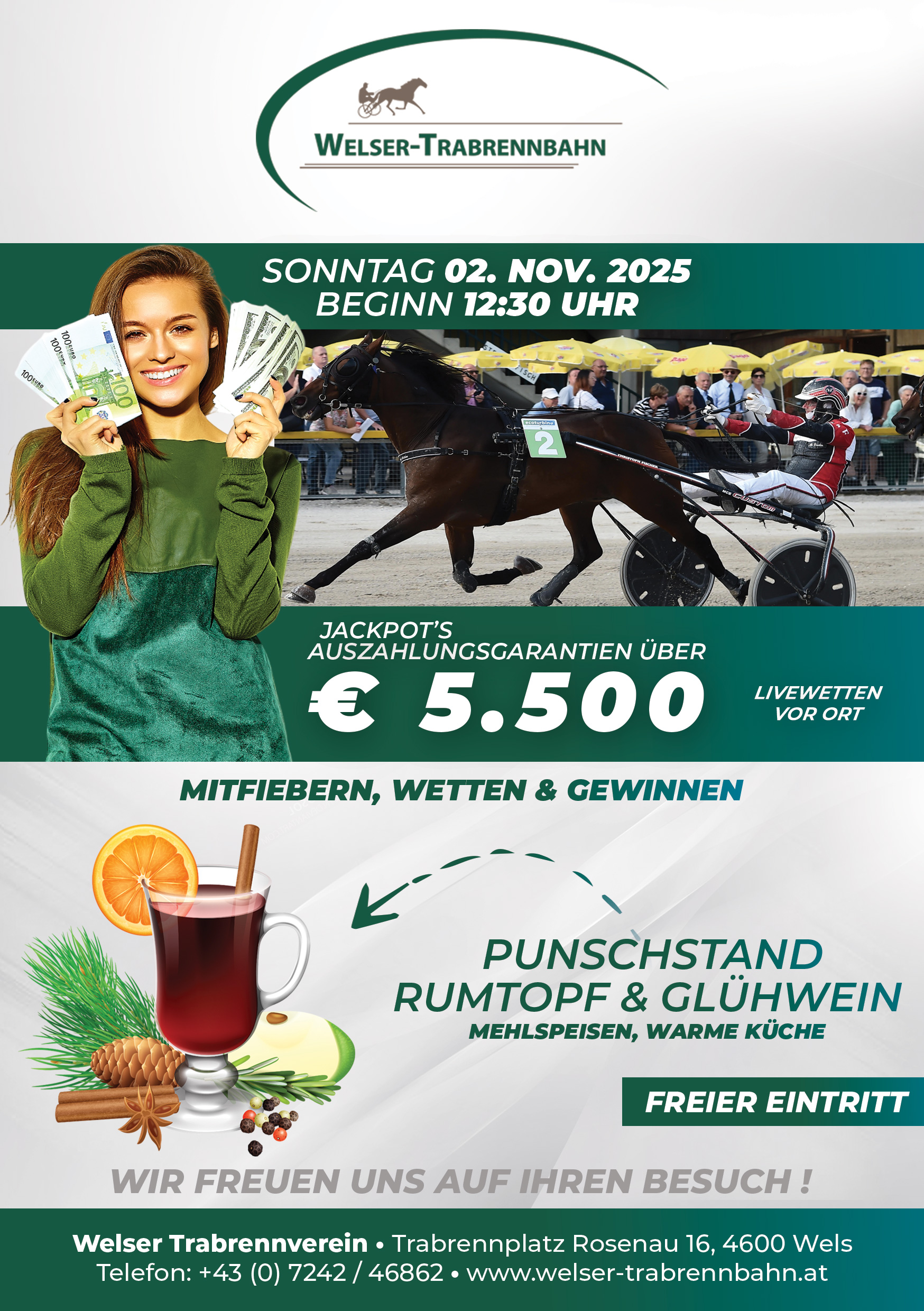 Matrix Venus (6) gewann in der Vorwoche in der Krieau einen ähnlichen Bewerb, läuft in Wels immer starke Rennen und sollte somit das zu schlagende Pferd sein. Faster than Usain (4) verkaufte sich bis auf den fehlerhaften Auftritt zuletzt in den Freunde-Rennen immer sehr gut und sollte somit den Weg in die Top-3 finden. Bijou Noir (5) startete nach längerer Pause zuletzt in Kirchberg mit Rang drei gut an und sollte durch dieses Rennen gefördert abermals unter den ersten Drei zu finden sein. Madness (3) konnte zuletzt nicht wie gewünscht reguliert werden, ist ansonsten aber ein Garant für Platzgelder in den Freunde-Rennen, womit er bei Schwäche des Favoriten-Trios um ein besseres Geld einspringen wird. Jace Renka T F (2) lieferte in der Vorwoche eine starke Leistung ab und sollte bei Bestätigung wieder um eine gute Prämie abbekommen können. Max Lobell (1) nimmt doch einiges an Geldgewinnen gegenüber der Konkurrenz auf und ist daher Außenseiter.