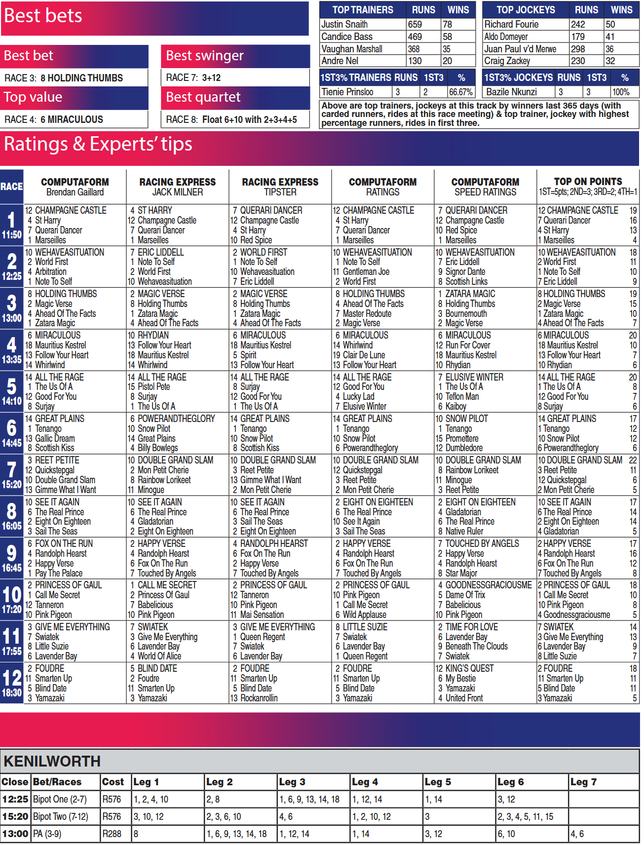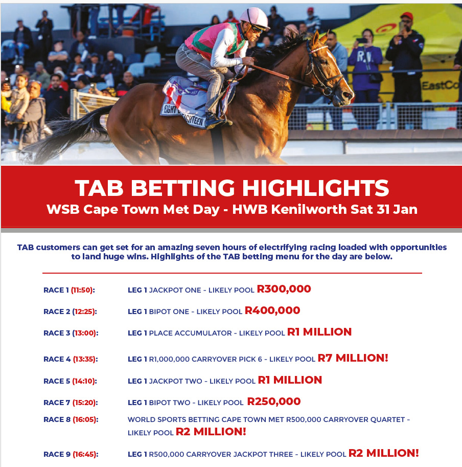 Weiterer Gruppe-Renntag mit Jackpot-Festival am Samstag, 31.01., in Kenilworth Erster Start: 10.50 Uhr World Pool - 7 x René Piechulek am Start - Pickwetten und Viererwette mit carryovers Pickwetten 0,10 € - Viererwette 0,20 €