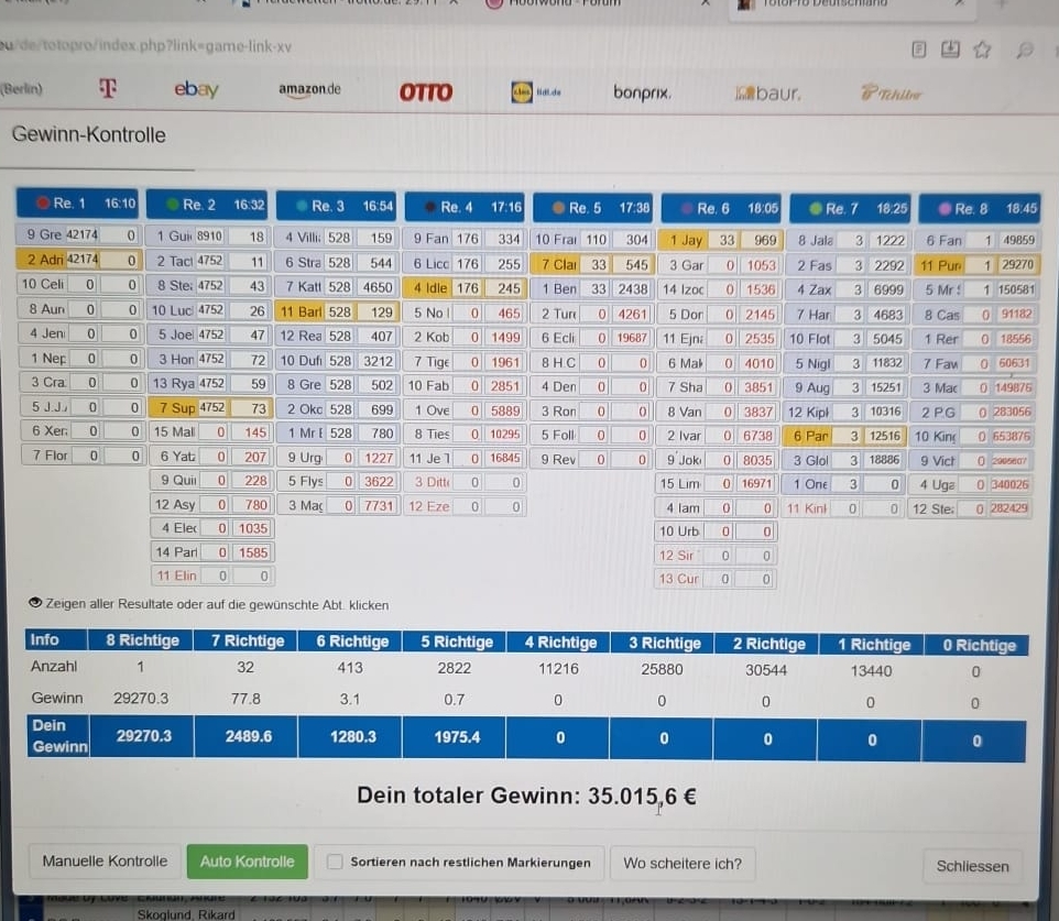 Gesamtgewinn auf allen Scheinen war 35015,60 € - pro Anteil 80,68 Herzlichen Glückwunsch an alle Gewinner und insbesondere an die beiden Kapitäne Anegio und Maiktino ! 👏 |