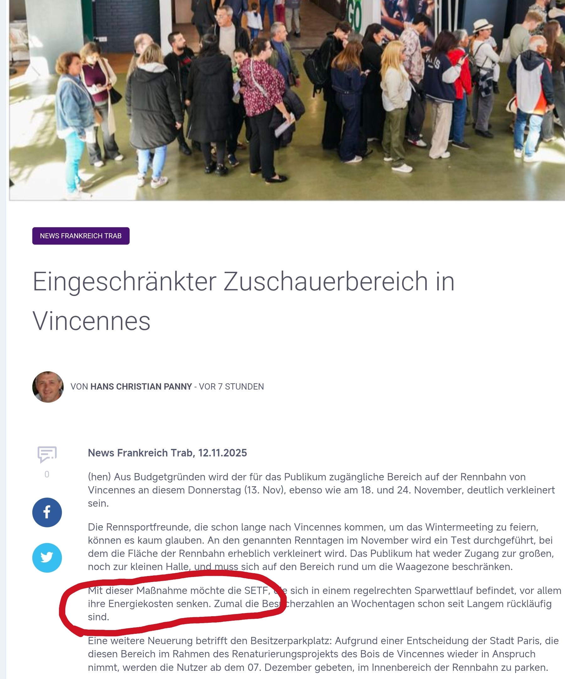 Vor ein paar Wochen nach Besuch rdes Criterium Renntags hab ich hier geschrieben..., "Der Temple du Trot ist mit dem Beton Charm der 70er stark in die Jahre gekommen. Es wird reichlich kosten das nachhaltig energetisch zu sanieren. Ob die bessere Entscheidung statt kleinere, modernerer Tribüne in Enghien auf eigenem Boden halte ich für fraglich oder zumindest habe ich Vorbehalte gegenüber des Jubels wg der Pachtverlängerung" Ja, auch ich liebe die Magie all dessen was dort erlebt. Aber neue Herausforderungen erfordern ...... Neues denken. Tradition ist kein Gut an sich. Zucht ist das beste Beispiel für andauernde Veränderung u Progress Tradition hin o her. |