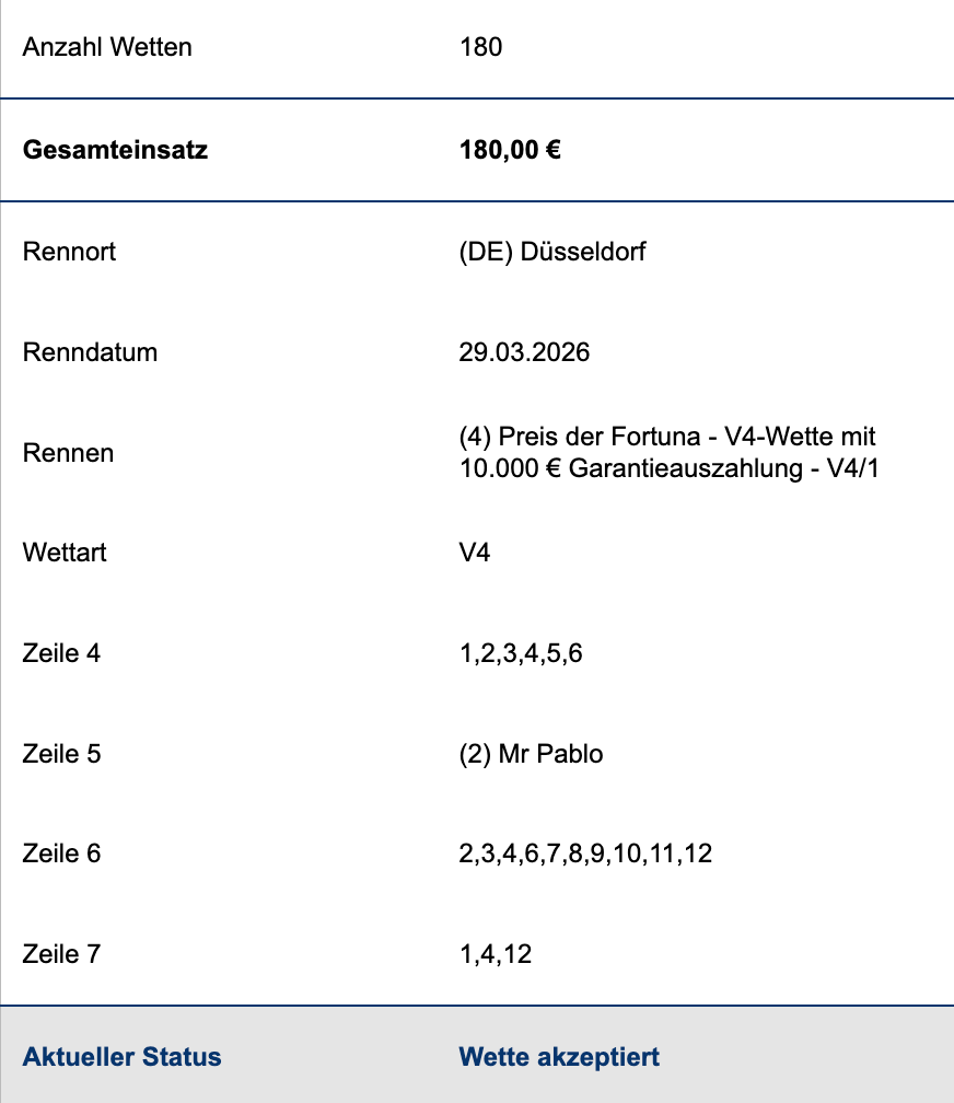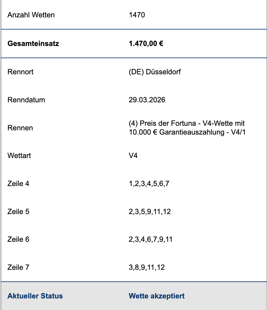 Wie schon der Pressemitteilung zu entnehmen war, wird es in der am Sonntag beginnenden Rennsaison in Düsseldorf eine „High Roller V4“ geben. Die Garantie beträgt 10.000 Euro (im JP-Fall deutlich höher) und der Rennverein hat sich verpflichtet, eventuelle Jackpots ohne Wenn und Aber jeweils in voller Höhe und am direkt nachfolgenden Renntag auszuspielen. Die V4 soll mit einem Grundeinsatz von 1 Euro stets über die letzten vier Rennen einer Veranstaltung laufen.