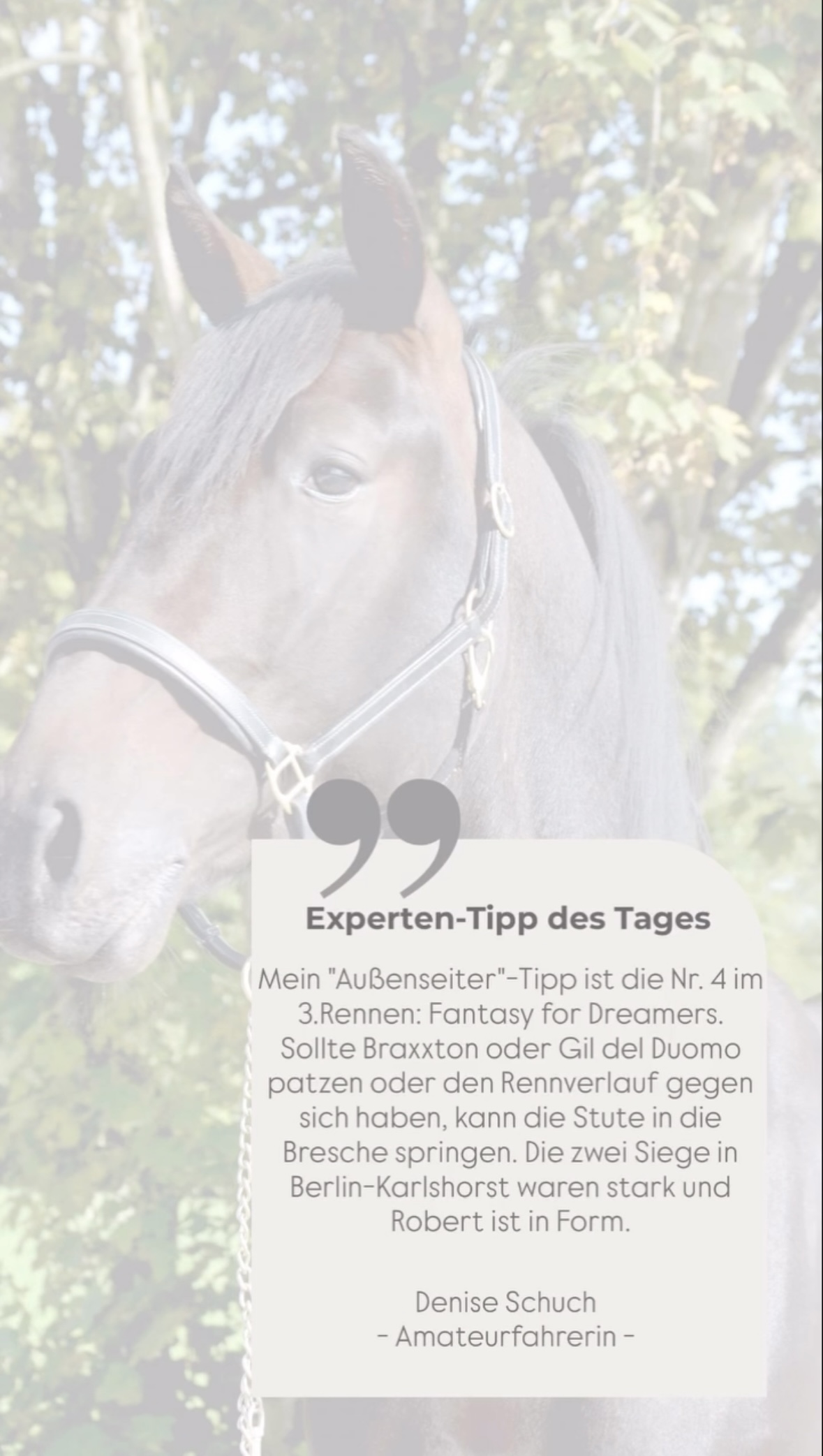 Corinna Seyfang schreibt: eh klar, eine grosse Stärke gegenüber seinen Gegnern wäre es wenn es regnet und die Bahn tief wäre, auch wenn er auf jeder Bahn zuhause ist, ein Allrounder mit dem Können bei einer nicht so guten Bahn klar seine Vorteile ausspielen zu können ist auch eine Waffe die ein Pferd zur Verfügung haben kann. weil die meisten das nicht können |