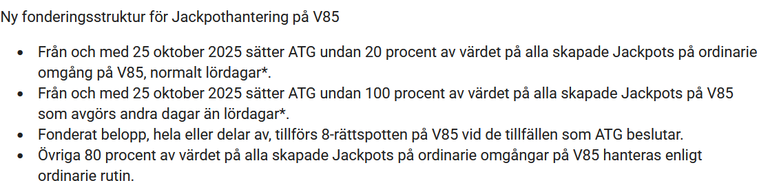 Natürlich nicht😅 ....Wird einen starken Start hinlegen. ATG hat Geld bereitgestellt und verfügt derzeit über 94,2 Millionen SEK an Fördermitteln. Ein Teil dieses Geldes wird in die erste Runde investiert. – Es sind mindestens 50 Millionen, wahrscheinlich etwas mehr. Das wird einen starken Start ermöglichen und Raum für weitere attraktive Jackpot-Runden im Herbst lassen, sagt Lina Wallin und fährt fort: – Wir werden natürlich ein attraktives Premierenangebot haben, aber V85 sollte auch jede Woche nach der Premiere und noch lange danach relevant sein. Es ist also ein Kompromiss, und wir denken, dass 85 Millionen für die Premiere ein wirklich starkes Angebot sind, während wir jetzt, angesichts der Entwicklung des Jackpots, wahrscheinlich zu einem anderen Zeitpunkt zwischen der Premiere und Winterburst Ende Dezember einen weiteren Multi-Jackpot anbieten können Quelle:Sportbladet |
