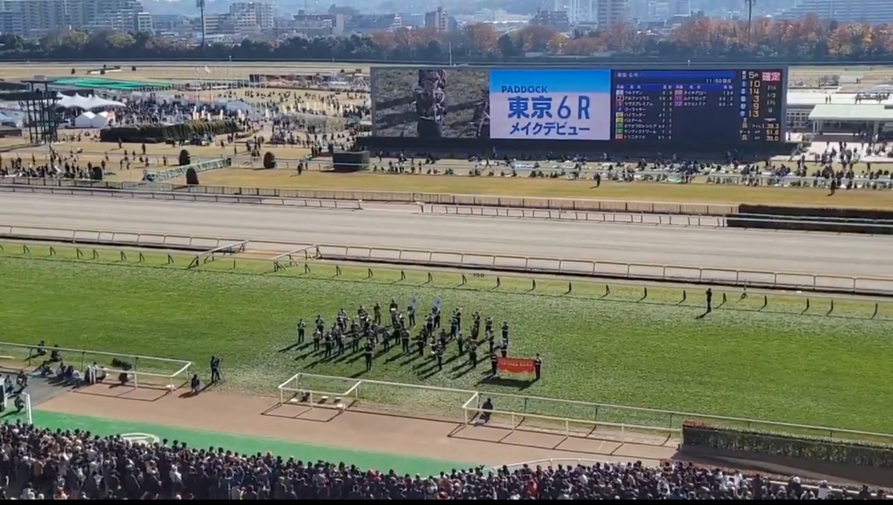 Auf der abgedunkelnten Bahn in KYOTO wurde gestern auf der riesigen Led Wand der Triple Crown Erfolg von Deep Impact gezeigt(2005) während das Abbild mit Drohnen in den Himmel projeziert wurde. "Vincennes" war leider beim Debut Kopf geschlagen. |