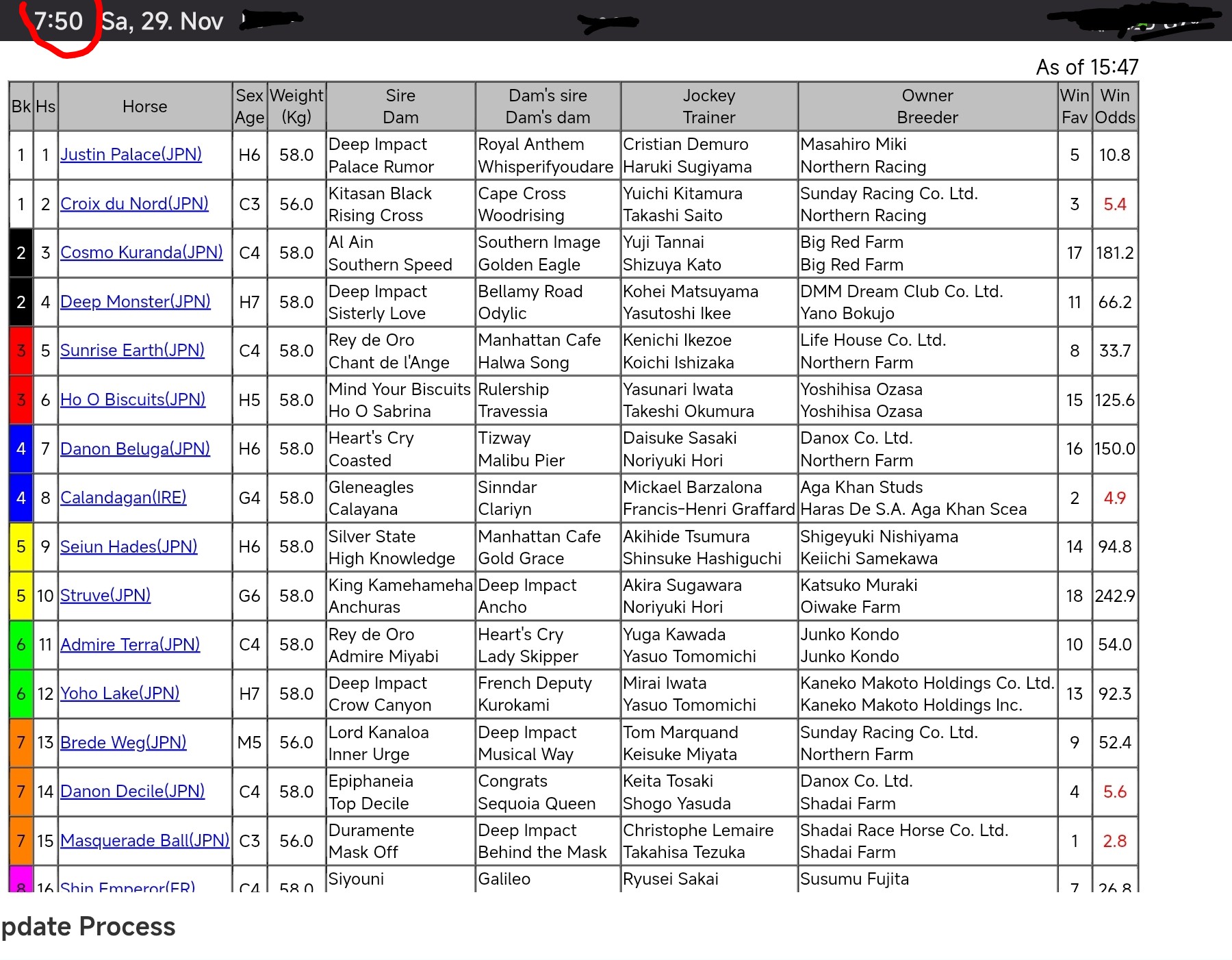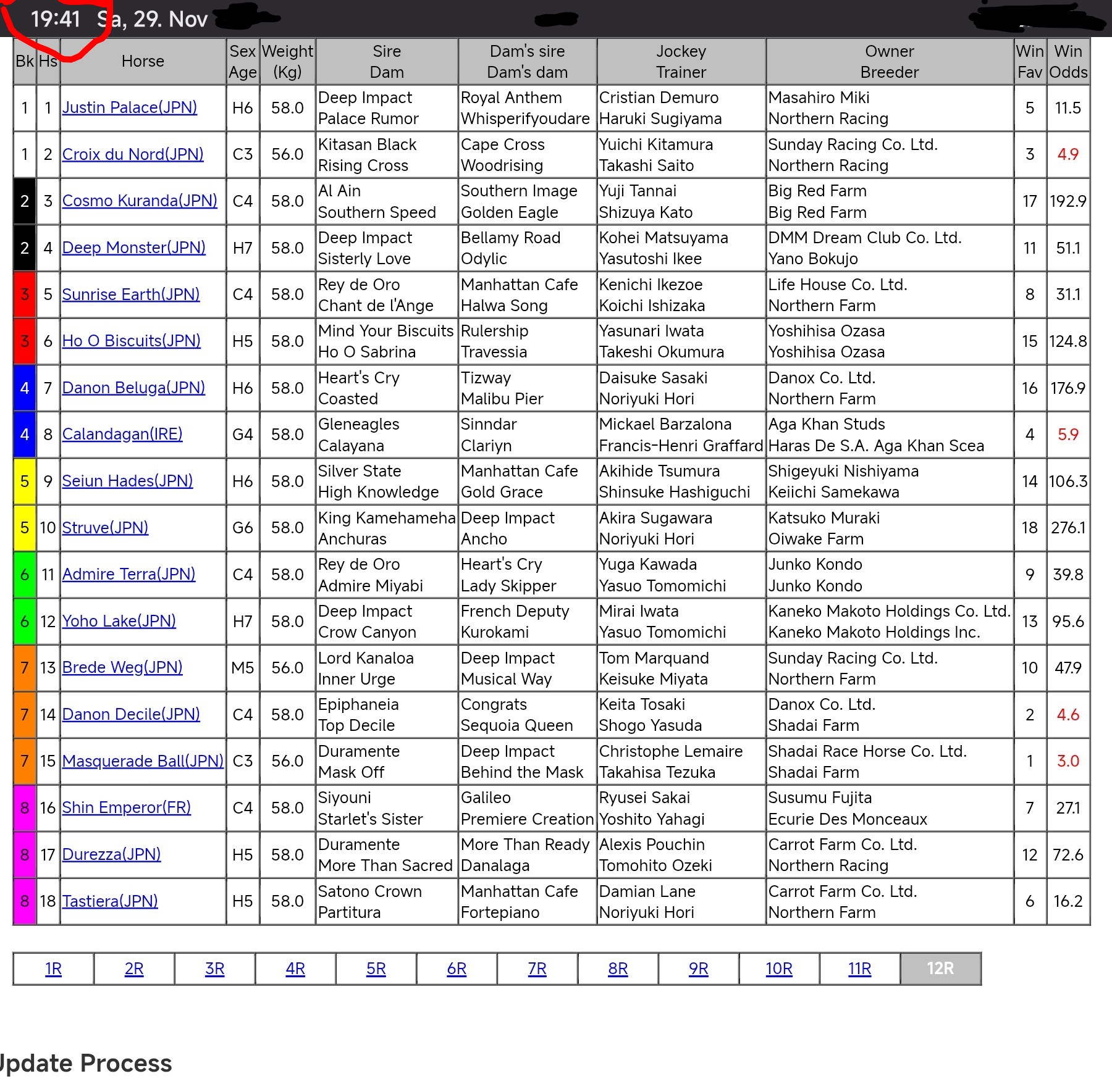 Racecard fürs Arima Kinen morgen früh. In der 1. Spalte u.a.. die letzte verpflichtende Arbeit gegen die Uhr als Konserve. Weitere Spalten die letzten Rennen. Die Körpergewichte werden 1. Std. vor dem Rennen aktualisiert. In der Tabelle steht das rote Kürzel na für not avalibel weil im Ausland nicht gewogen. https://www.jra.go.jp/keiba/thisweek/2023/1224_1/ss.html |